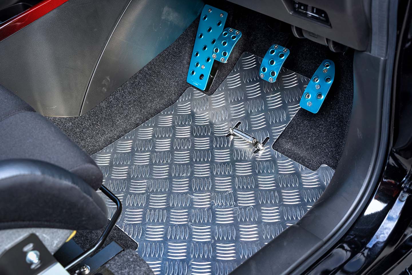 ドライバーフットレスト(9680円)、アルミペダルカバー(8360円)、フロアーパネル(2万5850円/運転席&助手席セット)といった操作系パーツもオリジナル。いずれもドライビング精度を高める実用アイテムである。