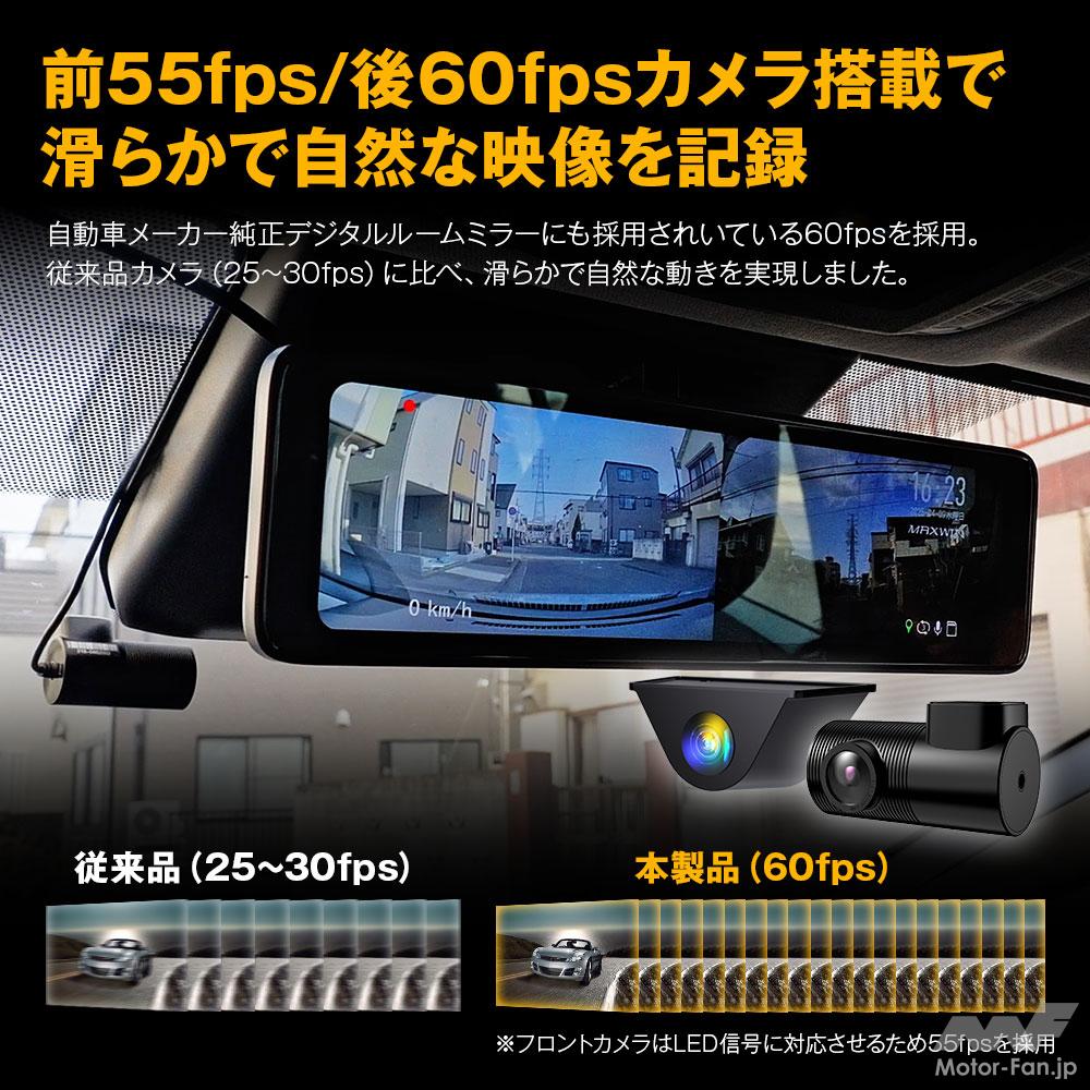 フレームレートはフロントカメラが55fps、リヤカメラが60fpsの設定で、一般的な25~30fpsのモデルに比べ滑らかな動きの映像を捉えられる。デジタルルームミラーの映像も見やすく自然だ。