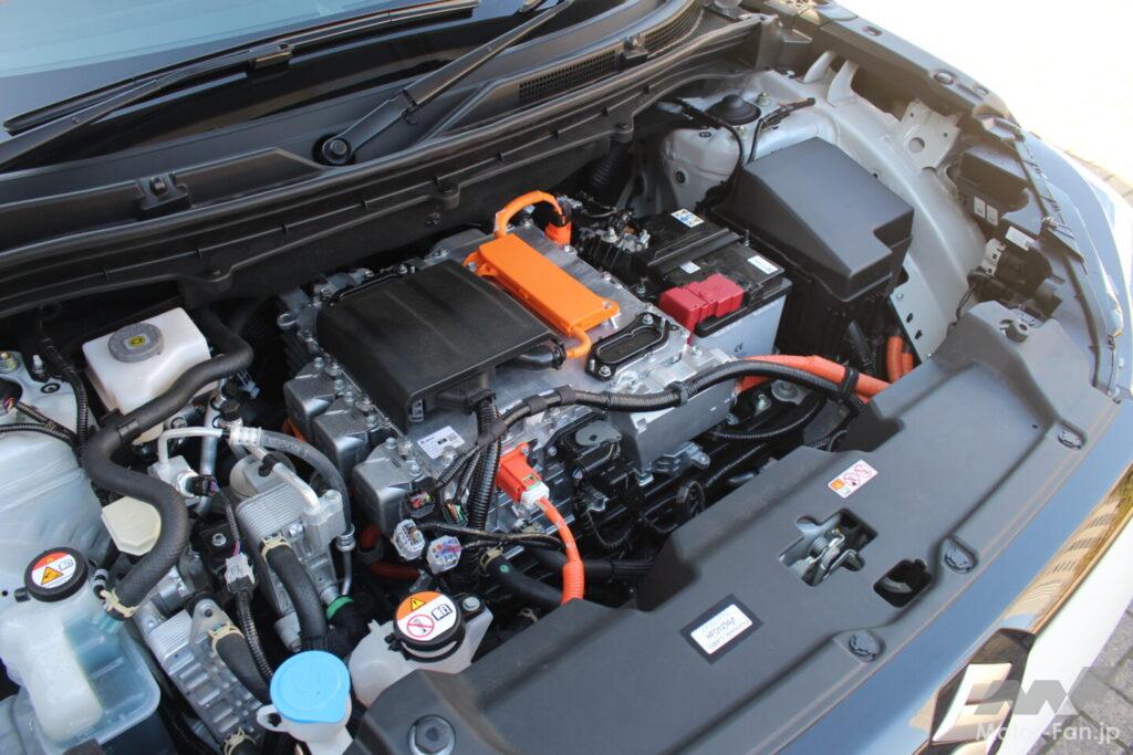 EVの最高出力はバッテリーの性能に左右される部分もあり、前後モーターを積んだ4WDと、フロントモーターだけのFWDでは、システム最高出力については大差ない(4WD:135kW、FWD:128kW)。ただし、加速感に影響が大きいトルクについてはシングルモーターのFWDは200Nm足らずとなっている。