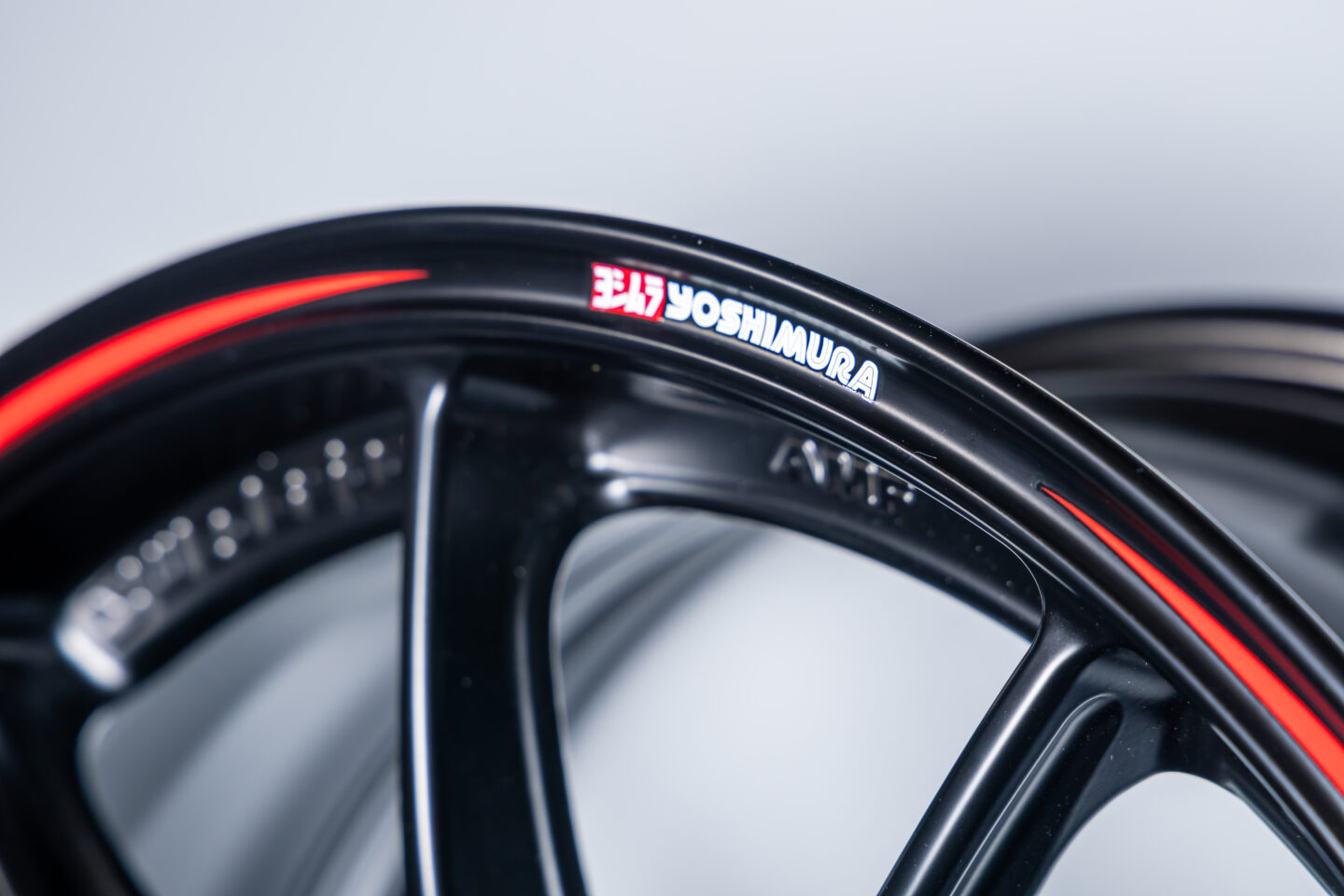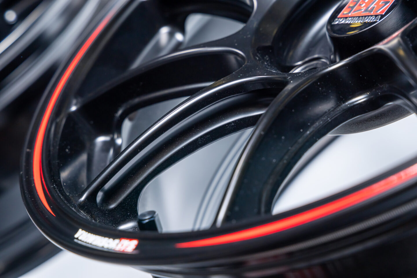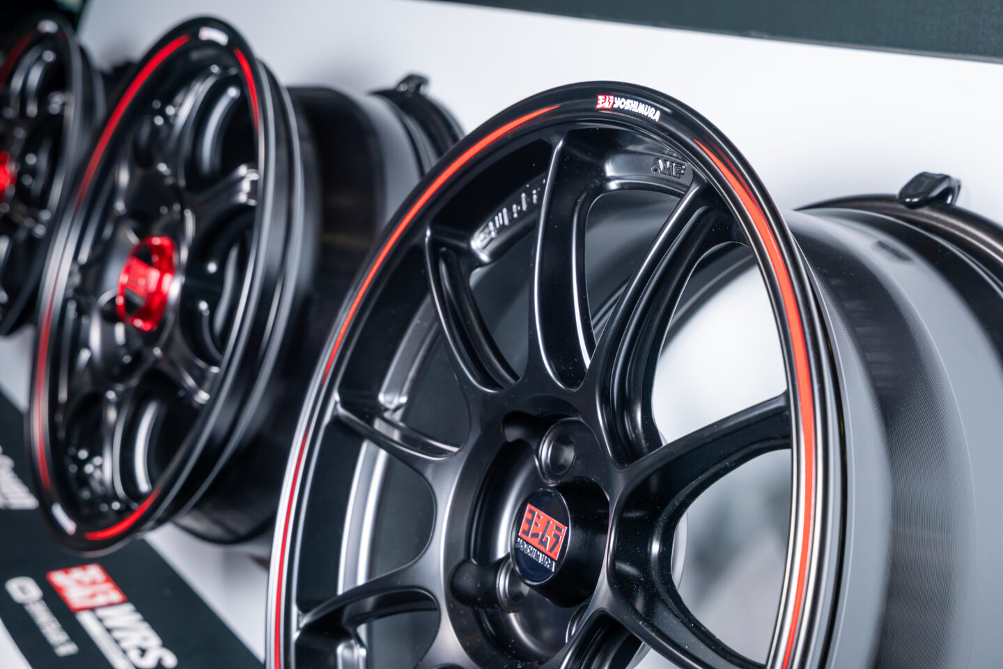 ベースとなるTC105Xは、すでに完成度の高いホイールであることから、機能や性能面に変更はない。その代わりに、ヨシムラの意匠と世界観を投影している。ホイールカラーには通常設定のないマットブラックを採用し、リムにはヨシムラのロードレーサーを想起させる赤いラインをあしらう。オプションとなるセンターキャップも樹脂ではなくアルミ削り出しとすることで、熱の問題や脱落リスクに配慮。スポーツカーオーナーを見据えた姿勢が表れている。