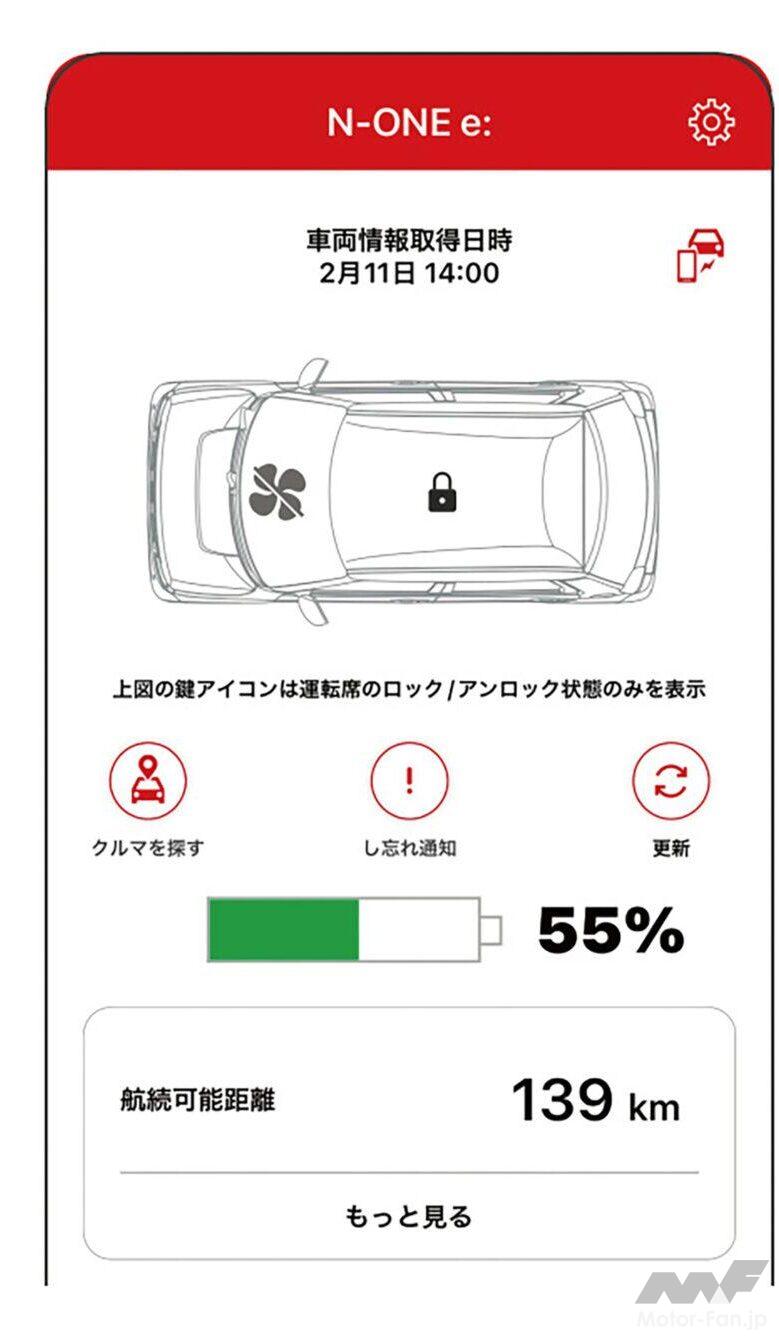電気駆動系はN-VAN e:とまったく同じで、バッテリー容量は29.6kWhだが、1充電あたりの走行可能距離は295kmと、N-VAN e:より50km長い。これはN-ONE e:のほうが車重が軽く、かつ空気抵抗が小さく、タイヤの転がり抵抗も小さいためだ。充電は急速充電と普通充電の両方に対応しているが、エントリーの「e:G」は急速充電機能がオプション設定。急速充電がまで対応しているのは、ライバルに対するアドバンテージ。残量10%から80%まで充電するのに、50kW充電器なら30分あればOKだ。急速充電器使用時には、これまでのようなカードの使用やパネル操作を不要にした„プラグアンドチャージ機能"が採用され、面倒な手間から解放された(ただし対応充電器に限る)。