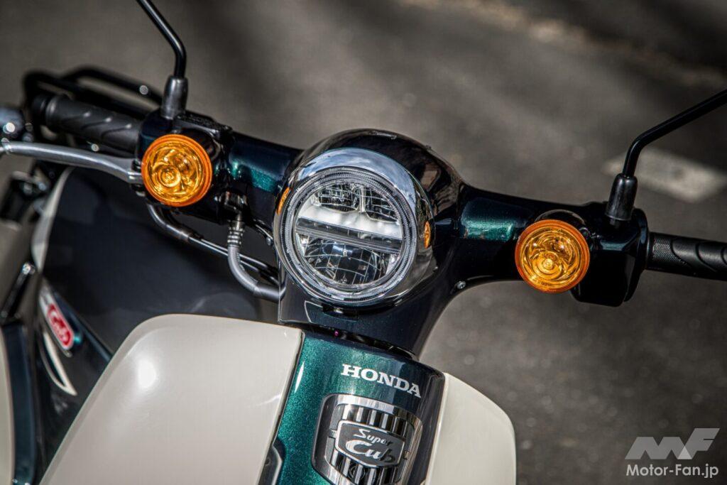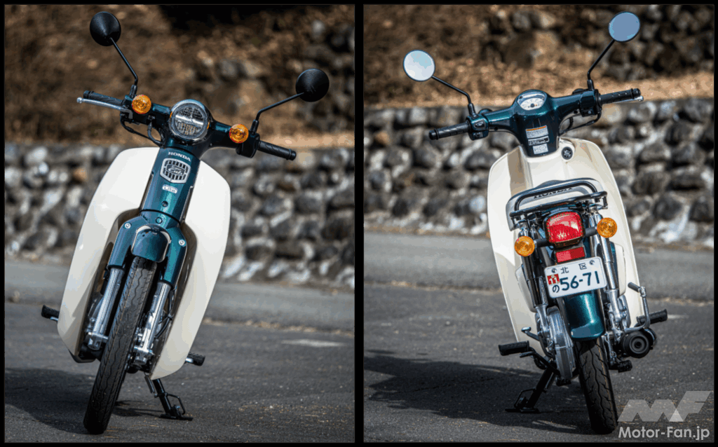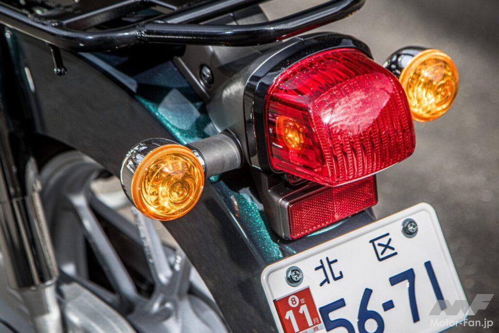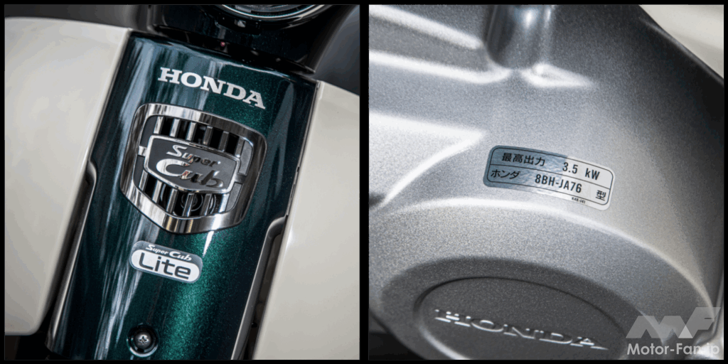 110と110 Liteの外観上の違いは非常に少なく、タンデムステップの有無や前後フェンダーのデカールが主な判別ポイントだ。見慣れたスーパーカブ110の車体に白ナンバーが付いているのは、何とも不思議な感覚ではある。