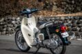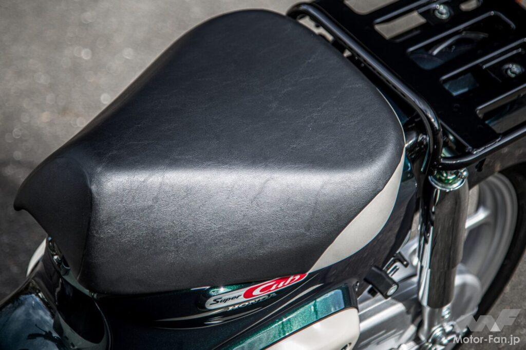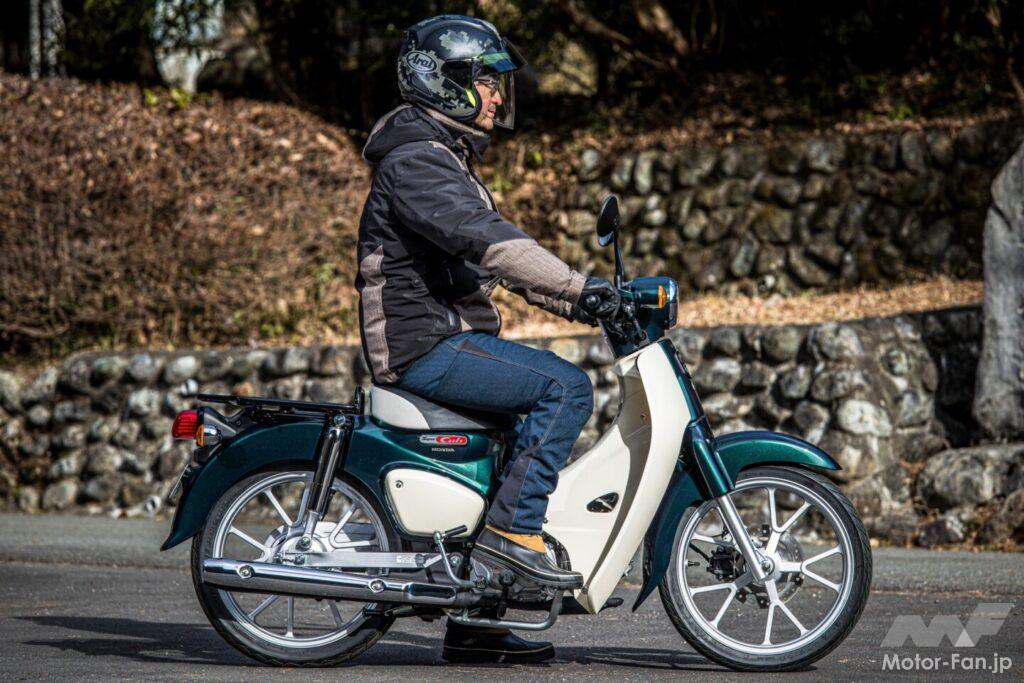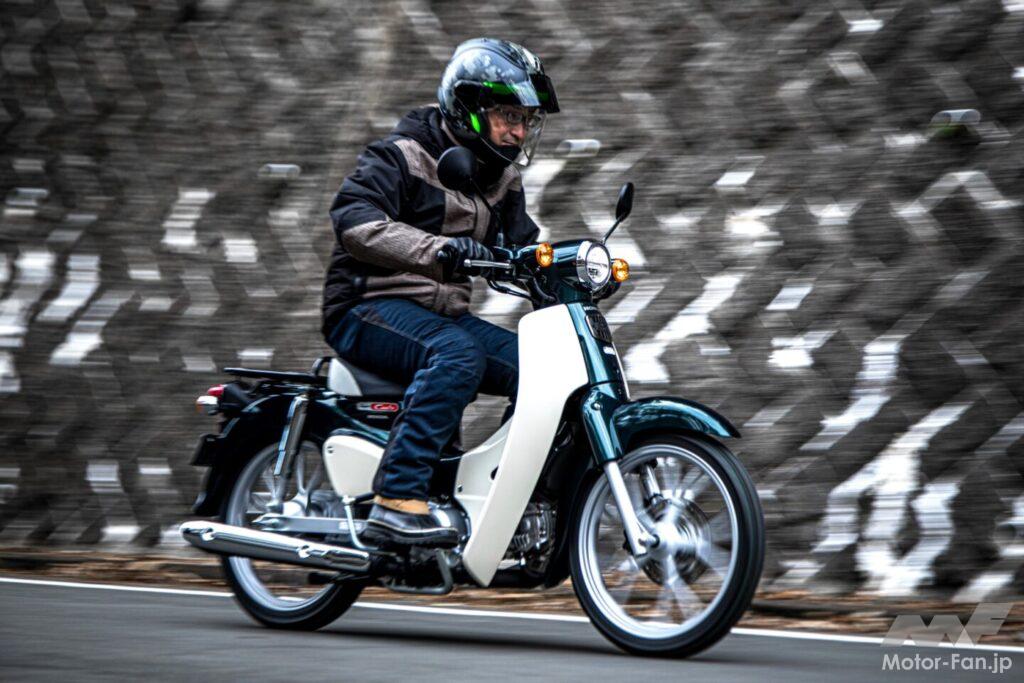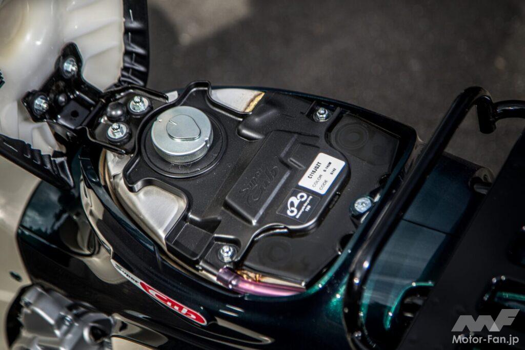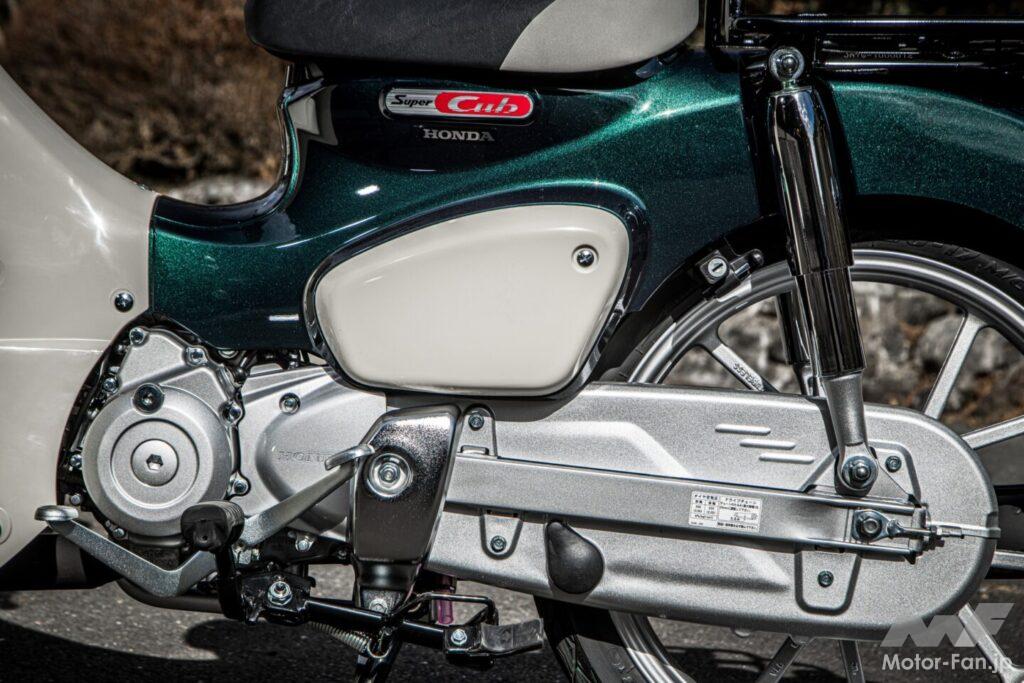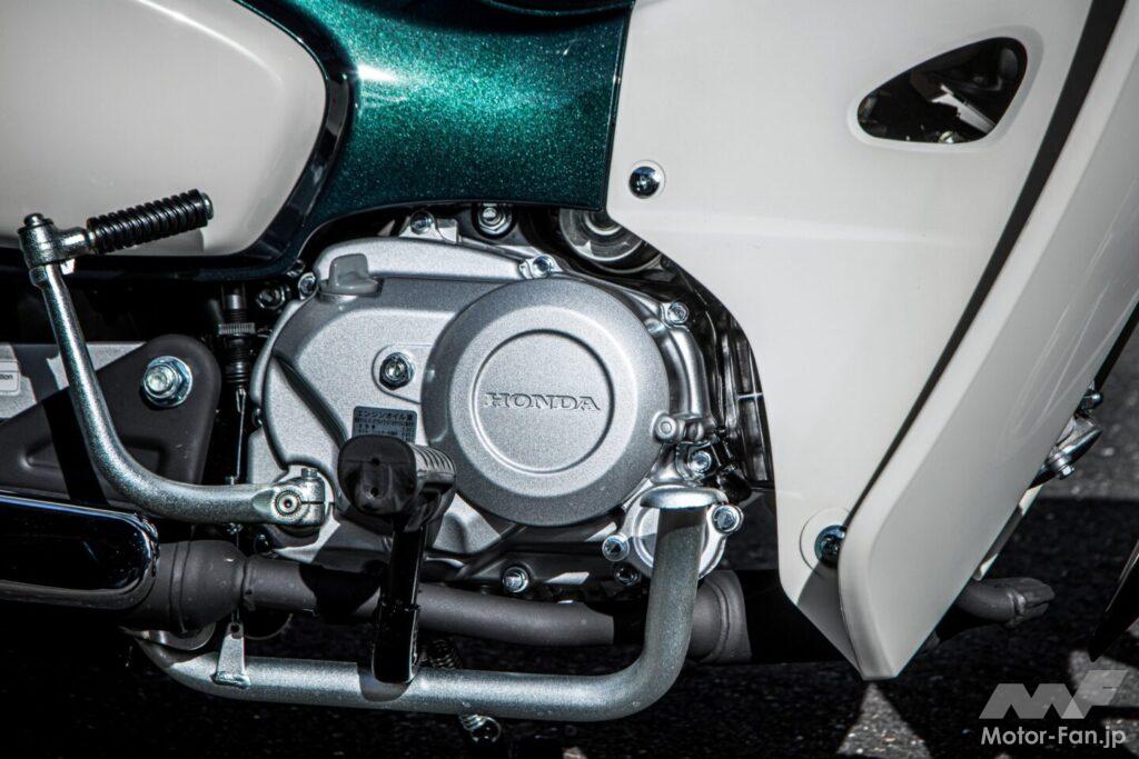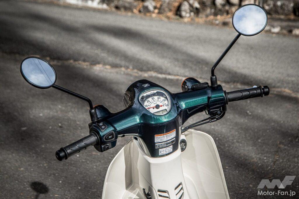 セルボタンを押してエンジンを始動する。スーパーカブらしい柔らかくも歯切れの良い排気音は、110とほとんど変わらない。サイレンサーの刻印が同じなので、おそらく共通パーツなのだろう。最高出力は40%も減じられているが、エキゾーストノートにそこまで抑制された印象は一切ない。
