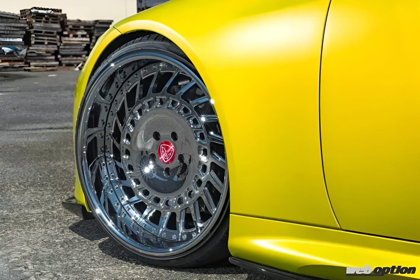 エアロパーツは全てレクソン製で、フロントリップスポイラー、サイドスプリッター、リアアンダーディフューザーという構成になる。大分県のカスタムショップ“スタンス”が手がけたこの車両は、マットイエローのラッピング仕様としたインパクト抜群のボディに対し、エアロ部分はブラックで統一。ボトムエンドのラインの一体感を向上させている。