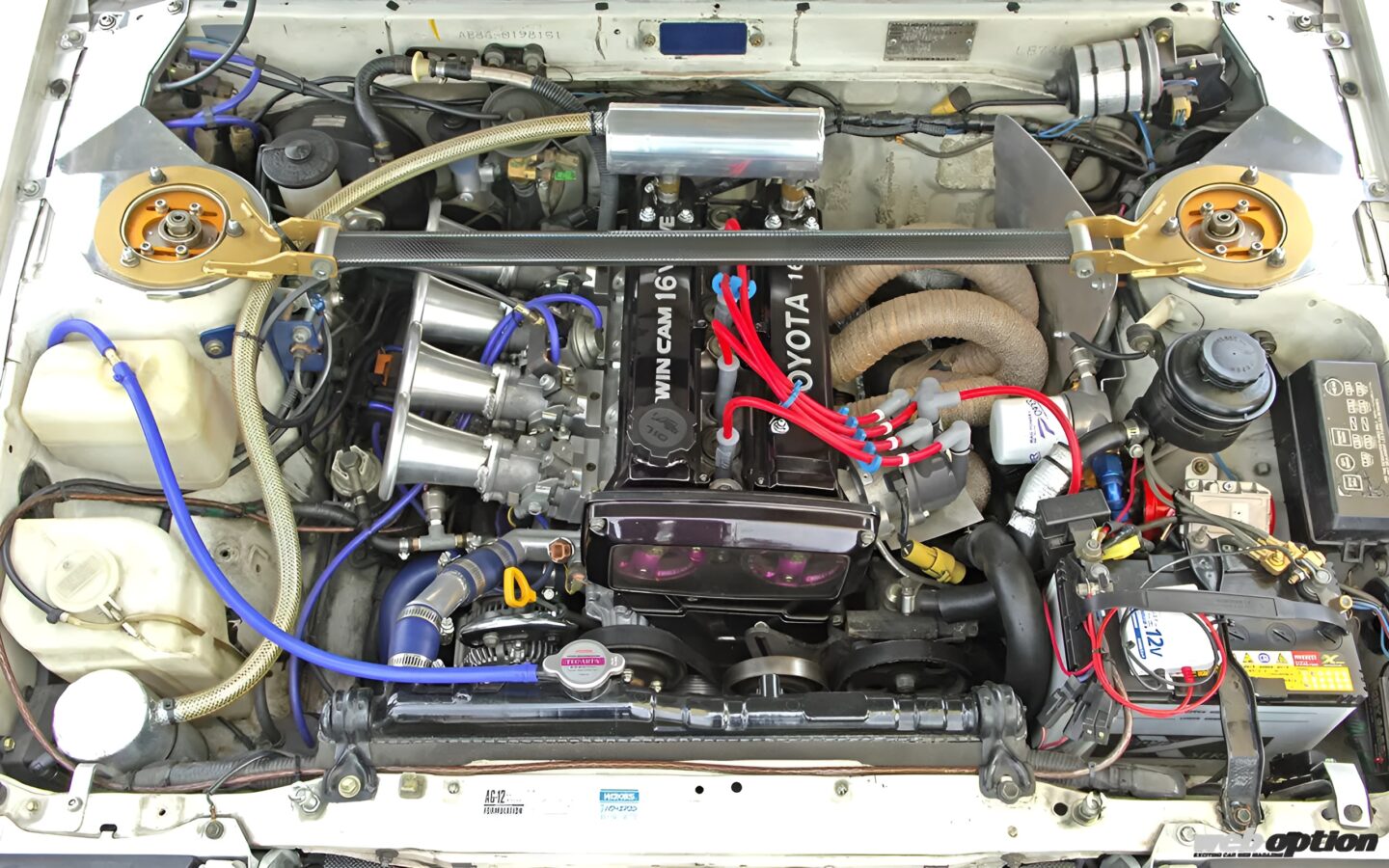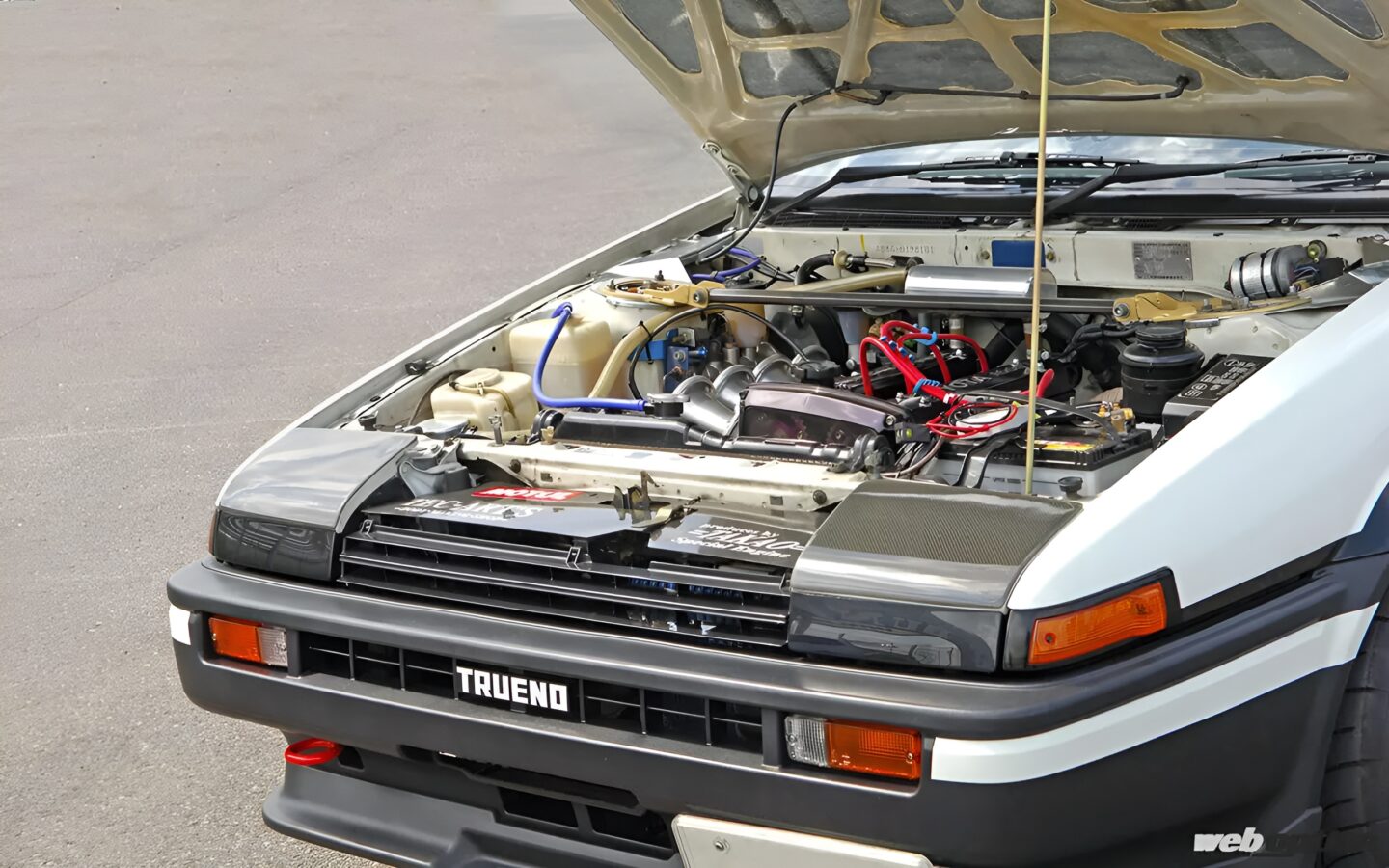 心臓部の4A-Gは、AE111用加工クランクにオリジナルピストンを組み合わせ、ヘッドにはAE92後期の4バルブヘッドを搭載。そこに300度を超えるハイカムと4連スロットルを組み込むことで、230psを発生させている。いわゆるテックアートの定番スペックだ。