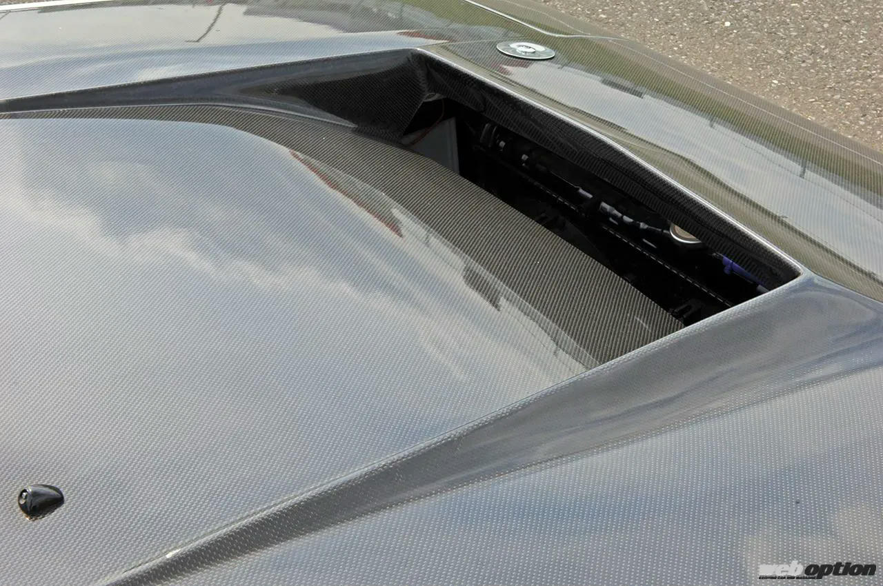 エクステリアはオリジナル+αを目指したスッキリ仕様。発熱量の関係からボンネットダクトとナンバー移動&バンパー加工が行われている。