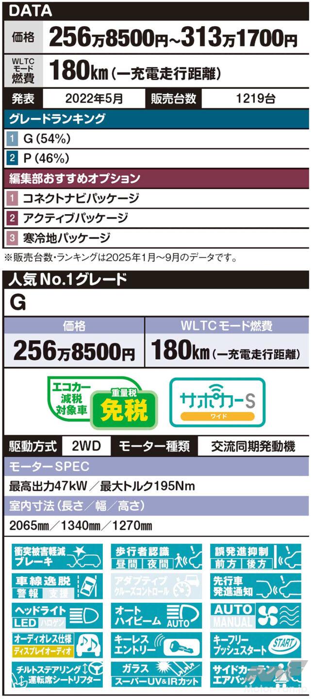 新車レビュー 「注目の軽EV」SUVらしい逞しさが自慢の『eKクロスEV』。日産サクラと共通する上質さも美点だ!【写真・18枚目】 『P』 『高速道路で便利なマイパイロット』前車との距離を一定に保つようアシストする全車速追従機能付きのレーダ ークルーズコントロールシステムをはじめ、車線中央を走るようにサポートする車線維持支援機構など「マイパイロット」が高速道路で役立つ。 『e-Assistが安全運転を支援』万一の際のリスクを最小限に抑えるe-Assist。歩行者や自転車も検知できる衝突被害軽減軽減ブレーキシステム、ペダルの踏み間違い衝突防止アシスト、先行車発進通知、ふらつき警報、車線逸脱警報といった先進の支援機能が充実。 『イノベーティブペダルオペレーションモード』アクセルペダルだけで減速も自在にコントロールできる。1ペダルだけで踏めば加速、戻せば減速。ペダル踏み替え操作の手間が減少し、ハンドル操作に集中できるメリットが高い。 『「ECO」「NORMAL」「SPORT」3つのモード』優れた“電費”をもたらす「ECO」、街中での車速をコントロールしやすい「NORMAL」、キビキビした走りが自慢の「SPORT」と3つのドライブモードを選択可。走行状況や気分に合わせて切り替え。 『グリップコントロールが発進をサポート』雪道やぬかるんだ路面で、駆動輪の片側が空転してしまった際、スリップしたほうをブレーキ制御、グリップできているほうの駆動輪の駆動力をキープして発進/脱出をサポート。 『簡単操作でチャージOK』一充電の走行可能距離はWLTCモードで180㎞。ポートは上が普通充電、下が急速充電。約8時間で満充電(AC200V/14.5A)されるので、帰宅後、朝までに完了できる。 ブラック内装 ライトグレー内装(オプション) 『MITSUBISHI CONNECT』人とクルマをつなぐMITSUBISHI CONNECT。クルマと離れていても好きなタイミングで充電やエアコンをスタートできる「今すぐ充電」「今すぐエアコン」、駐車位置を確認できる「カーファインダ ー」、緊急時に助かる「SOSコール」などのサービスを提供。 『マイパイロットパーキング』駐車したいスペースの手前で停止、マイパイロットパーキングスイッチを1回押すだけで、車両に備わった4つのカメラと12個のセンサーが作動し、駐車枠と駐車空間を検知し、駐車操作をサポート。 『7インチカラー液晶メーター』鮮明な画像と見やすいデザインで、メーター表示/ナビ表示/電力残量表示など、ひと目でわかりやすい車両情報を映し出す。 『長尺物もスマートに積める』後席は左右独立でリクライニングが可能。助手席を倒せば長尺の荷物も十分に積載可能。荷室幅は最大1105㎜、荷室高は865㎜でスーツケース2個を収納できる。 ※車両価格と燃費は最低値と最高値、発表は現行車がデビューした時期、販売台数とランキングは2025年1月から9月の統計データ。グレードやオプションランキング内の%は、各メーカーに実施したアンケート調査に基づくデータです(一部編集部おすすめもあり)。衝突被害軽減ブレーキ搭載車は「サポカー」対応になるが、サポカーS対応の場合は、上記の機能がプラスされることで「サポカーSベーシック」「サポカーSベーシック+」「サポカーSワイド」とグレードアップする。 ●[マークが緑色]→標準装備 ●[マークが黄色]→オプション設定あり ●[マークが薄い]→設定なし この画像の記事を読む