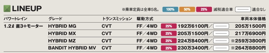 最大の変更点はパワートレインで、スイフトにも搭載される定評あるスズキ最新の3気筒、1.2ℓのマイルドハイブリッド+CVTを新搭載。これまではライバルとは違う4気筒エンジンが売りだったのだが、燃費は10%以上改善。FFで一部改良前の19.6㎞/ℓから22.0㎞/ℓに向上。4WDも20.7㎞/ℓとなり、駆動方式にわらず20㎞/ℓ以上の燃費性能を達成している(すべてWLTCモード)。さらに電動パーキングブレーキとオートブレーキホールド機能を新採用(ソリオ「MZ」とバンディット「MV」)! これまでの足踏み式パーキングブレーキより足元がスッキリし、ACC(アダプティブクルーズコントロール)の機能が高まり、全車速追従、停止保持、カーブ速度抑制、車線変更補助機能なども加わった。そしてオートブレーキホールド機能によって信号待ち、渋滞時などの一時停止時にブレーキを踏み続けなくて済むようにもなったのだ。