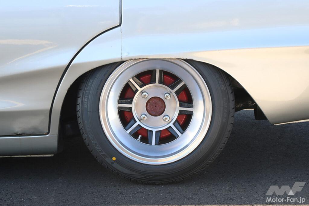 ホイールはハヤシストリートを履く。サイズはフロントが7J-14、リヤが8J-14で共にオフセットは不明。足まわりはフロントが12kgのバネにTRDショックの車高調、リアは8kgのバネにGABショック。ブレーキキャリパーはMK63を奢る。