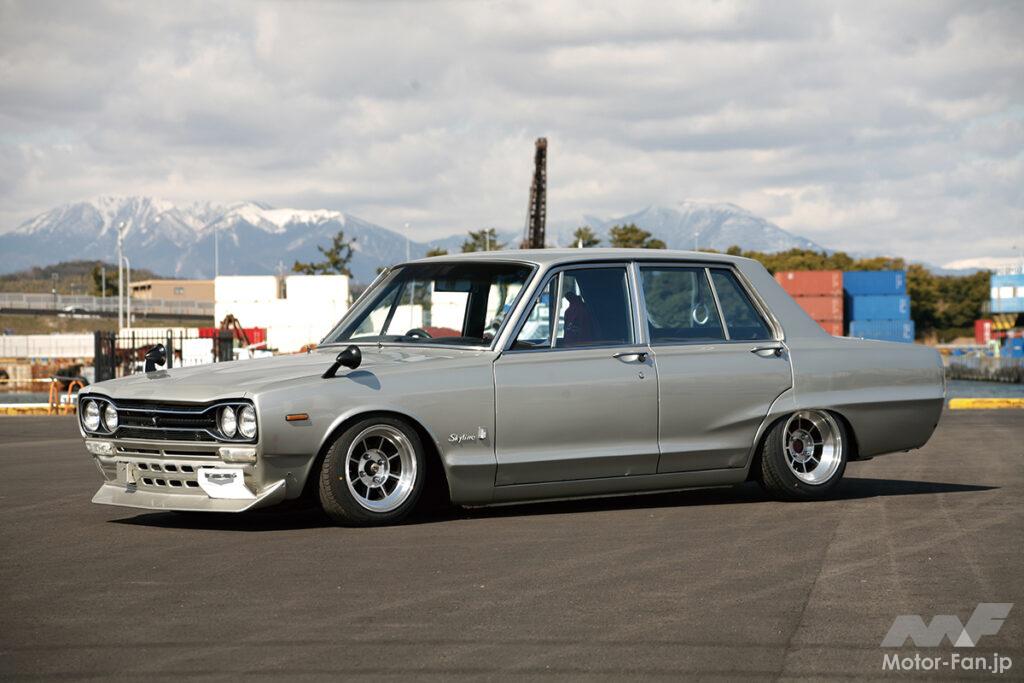 ほどよく落ちた車高がシブいハコスカ。オーバーフェンダーレスのノーマルフェンダー&サーフライン仕様と思いきや、絶妙にフェンダーが叩き出され、キッチリ仕上がっているこだわりの1台。