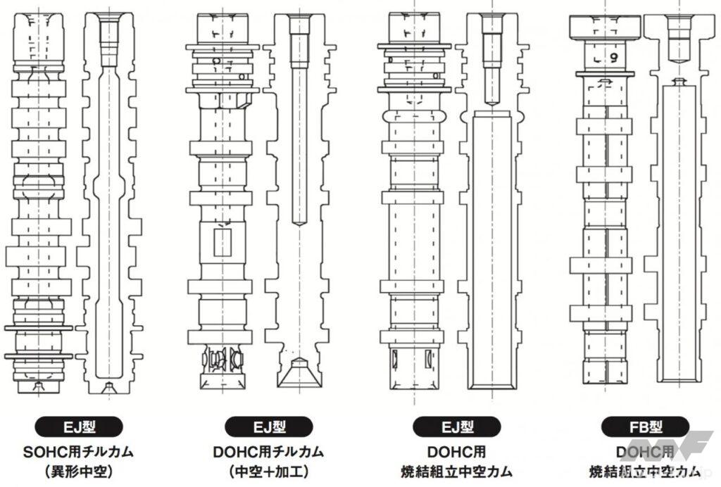 通常、カムシャフトは鋼(鉄材)を成形して造られる。しかし、富士重工業(現スバル)はEJ型の後期から引っ張り強度400MPa級引き抜き鋼製の中空パイプを使用している。鋳物や鍛造品に比べて軽いからだ。そのパイプに焼結合金製のカム山(カムロブ)を特殊な製法で合体させている。カムシャフトになったときのベース円直径は34mmであり、ほかのエンジンに比べると細い。しかも中身が詰まっていないから軽い。EJ20の最終型はベース円37mm径のカムシャフトだったが、それまでのものに比べて1本当たりで約400グラムも軽く出来たそうだ。