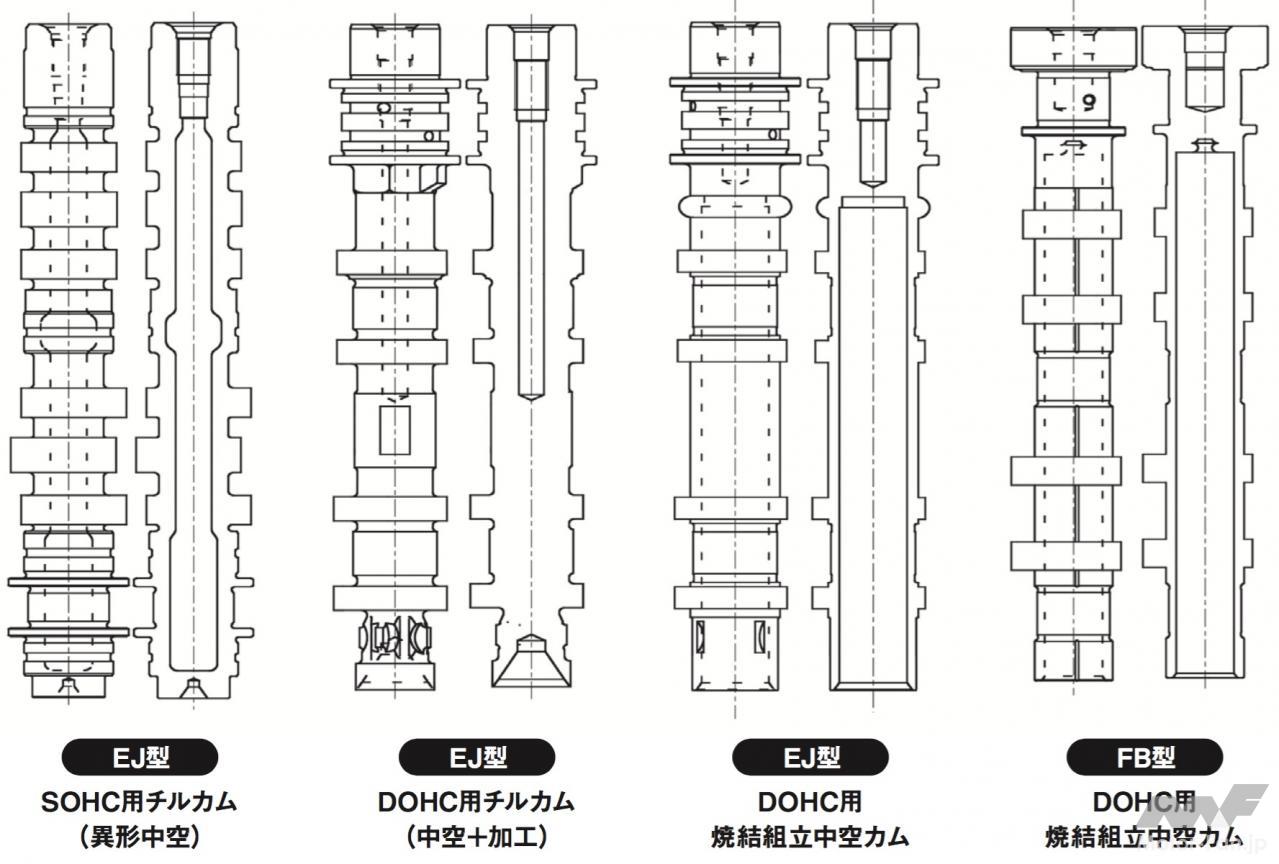 下に示すのは、水平対向エンジン用の歴代カムシャフト構造図。EJ初期型のSOHC仕様では通常の中実(中身が詰まった)鋳鉄製だったが、鋳込むときに中子を使い場所によって肉厚が変わるように鋳造された。EJ型のDOHCは、鋳鉄シャフトにガンドリルで深い穴をあけ、全体の半分以上を中空にしていた。大きく変わったのはEZ型(6気筒)からであり、富士重工業として初めて中空パイプを使用、それをEJ後期型に展開した。その進化版がFB用で、同じパイプでも肉厚を極限まで薄く攻めていることがわかる。