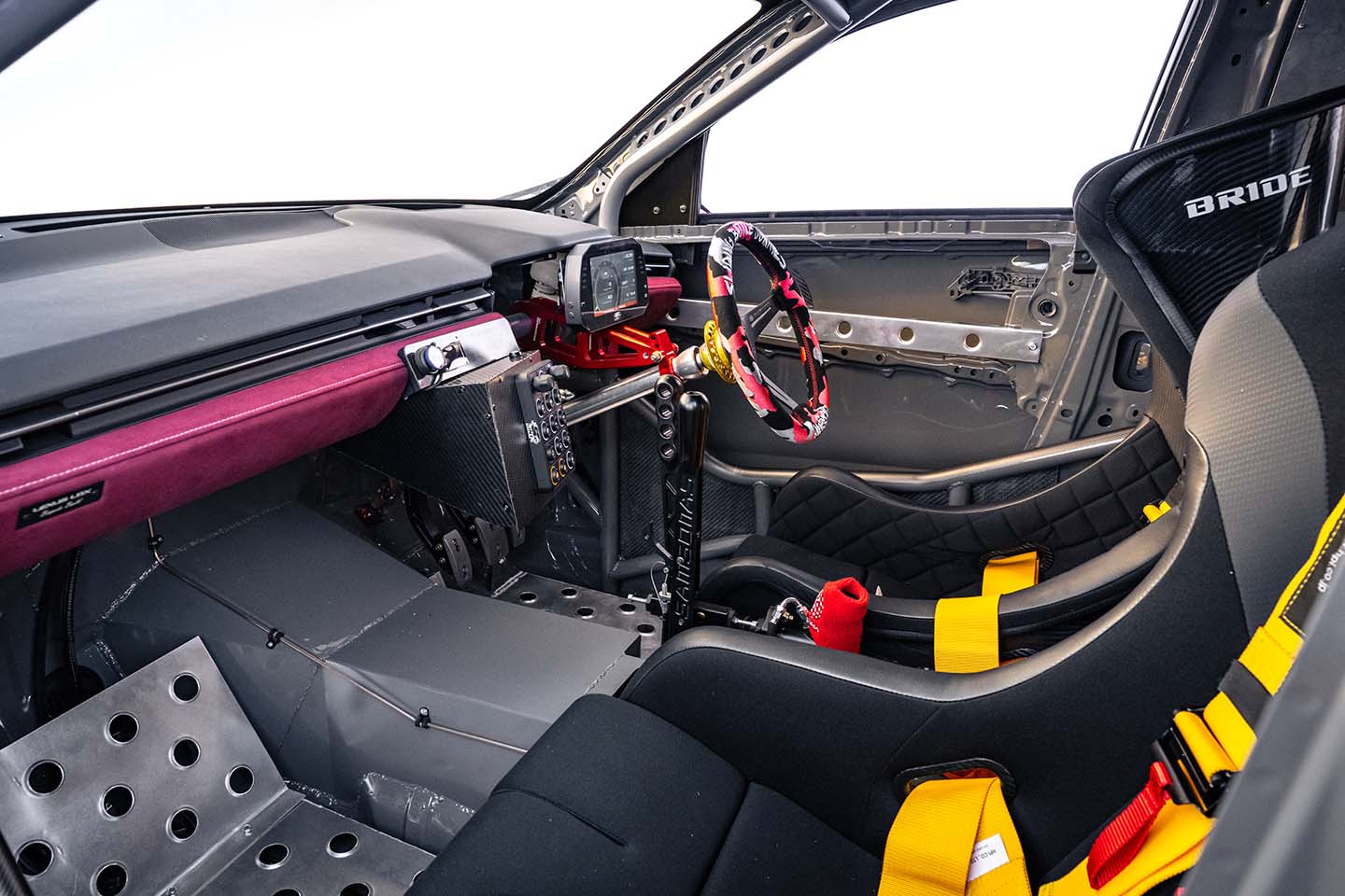 リヤサスペンションはGRカローラと基本的なアームレイアウトが共通で、主にアーム長の違いによるものだという。ただし、ナックル側のアーム取り付け位置を変更するなど、トラクション向上を狙った独自加工が施されている。車高調はDG-5の特注スペックで、スプリングレートなどは今後のテスト走行で煮詰めていく予定だ。