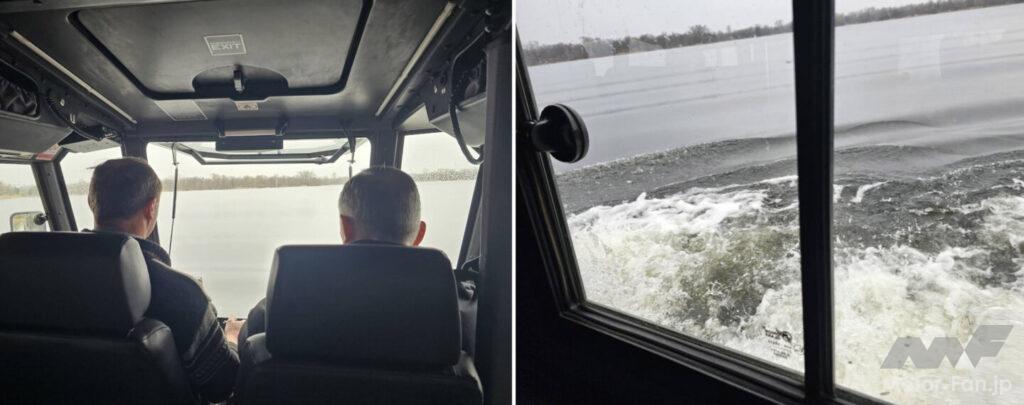 社長自らハンドルを握ってくれたのだが、彼は「沼地こそ、このクルマのもっとも得意とする地形なんだ」と語る。沼地を経て、メインイベントとなる湖沼へと進んでいく。水に入った直後は車体が沈み、怖さもあったが、すぐに巨大タイヤが浮袋となって水面走行を開始した。スピードはお世辞にも速いとは言えないが、安定している。