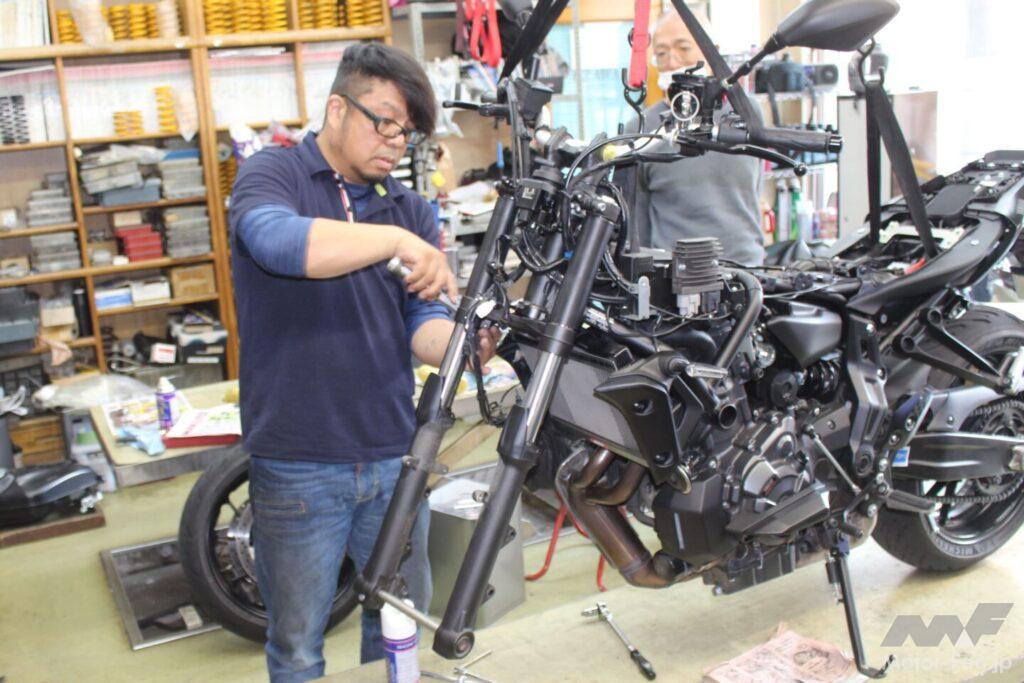 というわけで今回から3回に渡って、MT-07の足まわり改善作業をお届けするのだが、第1回目で紹介するのは僕が清本さんにオススメし、サスセッティングの前段階として行った、オザワR&D独自の定番メニューである“新車整備”。