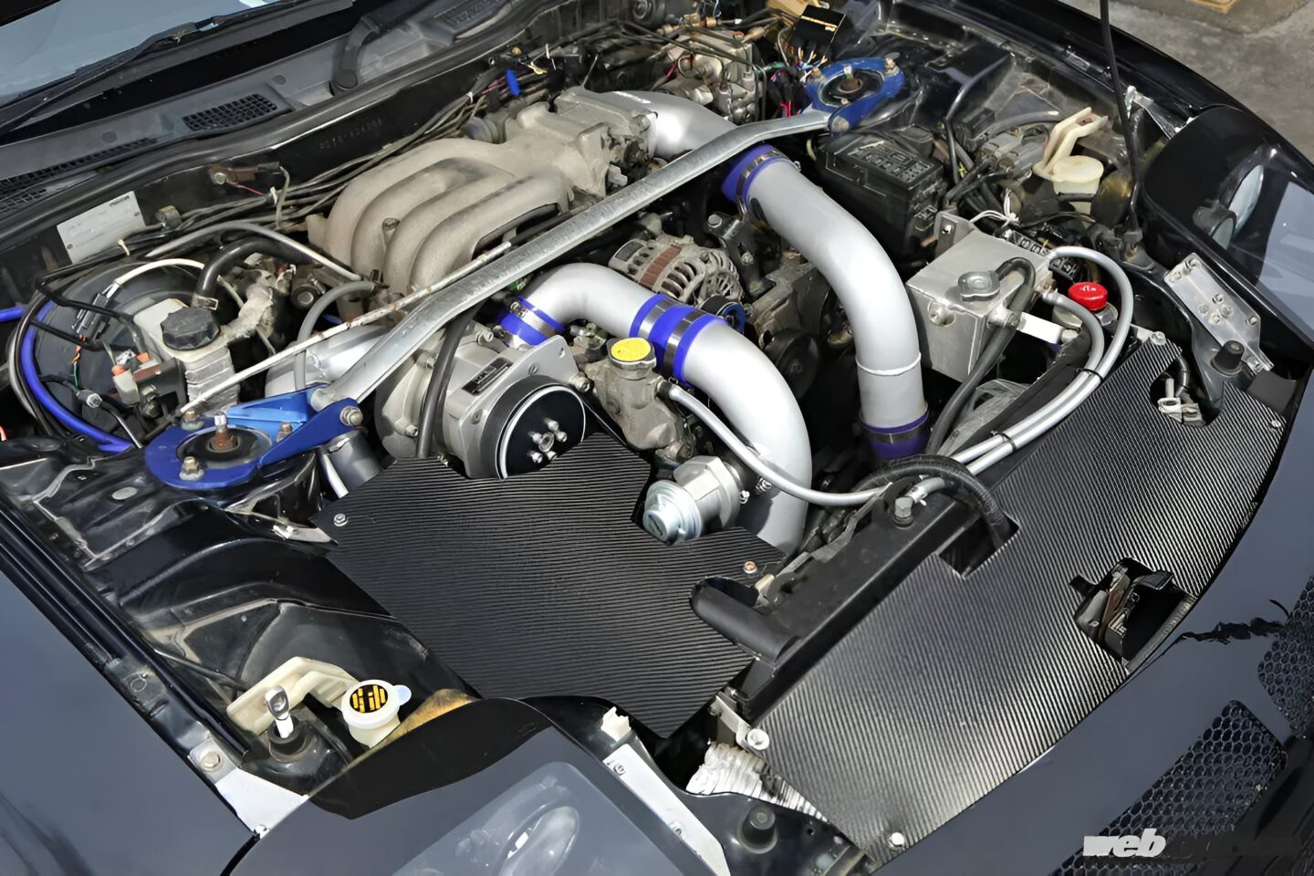 各種追加メーターを装着し、メーターパネルなどはカーボンシートでドレスアップ。インテリアのコンディションの良さは、オーナーの車両への愛情が感じられるものだ。