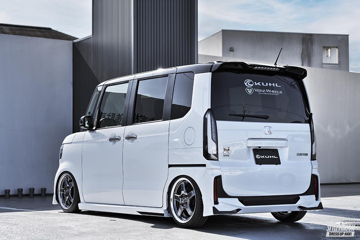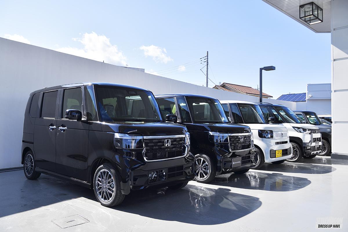 実はクールが軽カーを取り扱うのはレア。しかもハイトワゴンはNボックスが初という。「前型で要望が多かった。新型が出るタイミングもあり開発した」と片岡さん。黒のデモカーは車高はノーマルなのだが、それでも十分に映える! 普段使えるカスタムカーとしても魅力的だ。