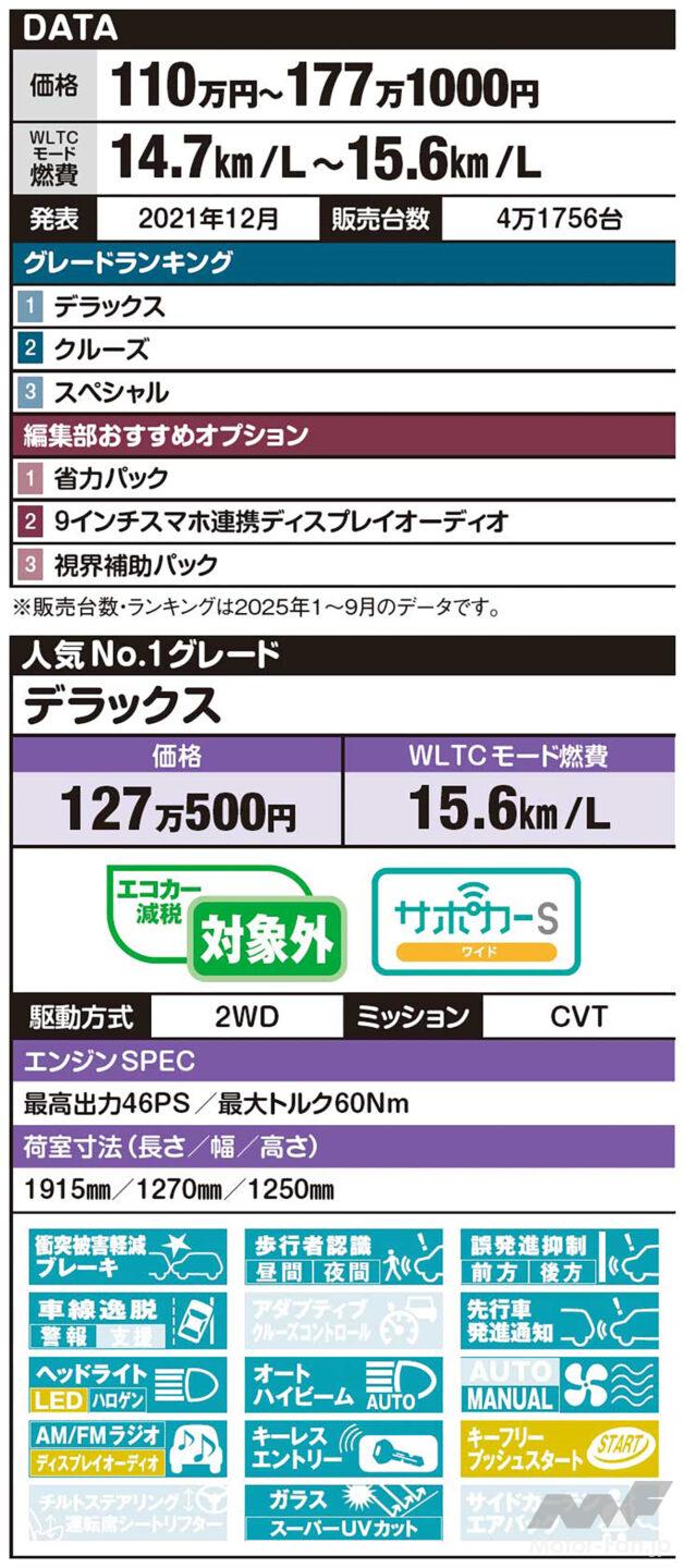 新車レビュー 「軽トップの荷室長1915mm。最長2650mmのハイゼット!」いま狙いめの軽バン&ワンボックス選び【写真・5枚目】 【デラックス】 『全モデル「スマートアシスト」装備』 歩行者にも対応した衝突回避支援ブレーキをはじめ、前後の誤発進抑制機能など、上級車種のみならずエントリーグレードに至るまで全車に「スマートアシスト」を採用。 『デッキバン』 ハイゼットカーゴにも「デッキバン」をラインアップ。アトレー同様「G」と「L」の2グレード構成で、「L」ではCVTのほかに5速MTの選択も可能だ。 ※車両価格と燃費は最低値と最高値、発表は現行車がデビューした時期、販売台数とランキングは2025年1月から9月の統計データ。グレードやオプションランキング内の%は、各メーカーに実施したアンケート調査に基づくデータです(一部編集部おすすめもあり)。衝突被害軽減ブレーキ搭載車は「サポカー」対応になるが、サポカーS対応の場合は、上記の機能がプラスされることで「サポカーSベーシック」「サポカーSベーシック+」「サポカーSワイド」とグレードアップする。 ●マークが緑色→[標準装備]/▲マークが黄色→[オプション設定あり]/◾️マークが薄い→[設定なし] この画像の記事を読む