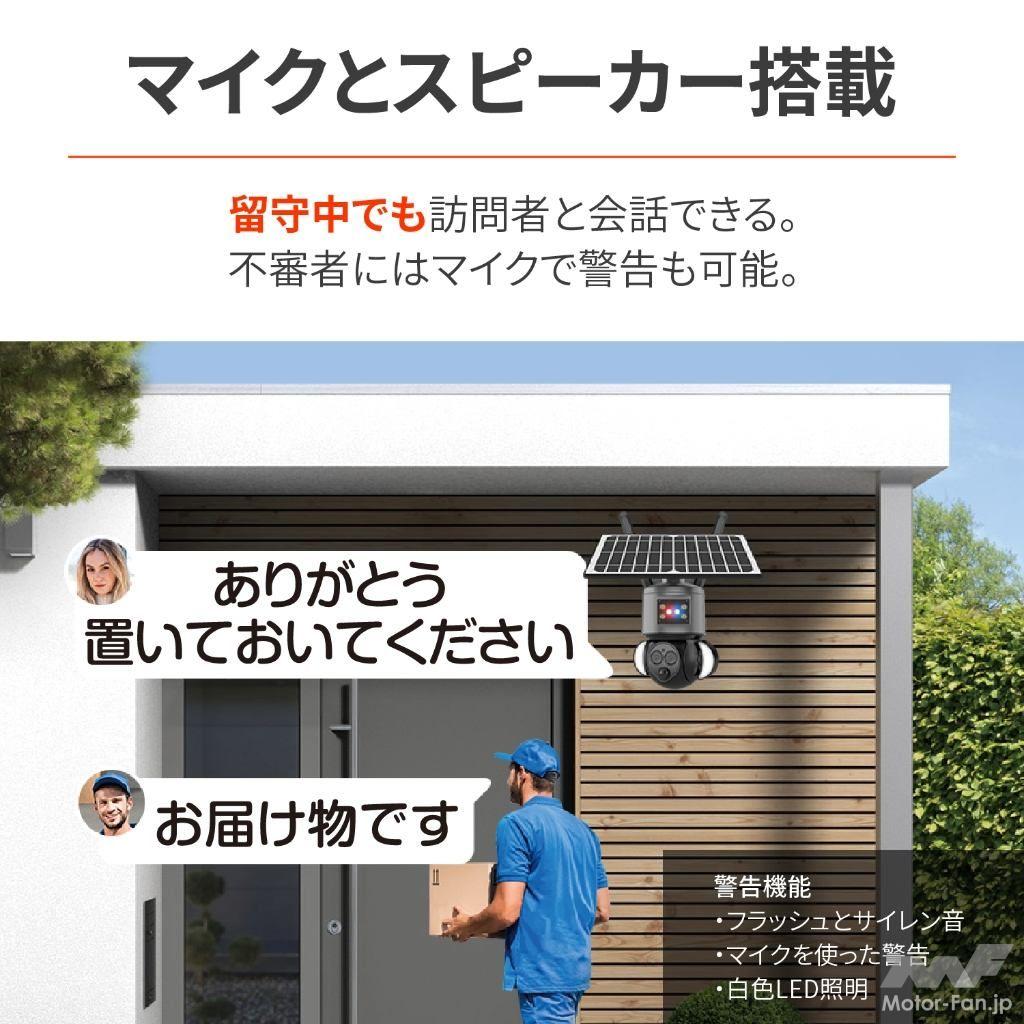 バイクやクルマの盗難予防はもちろん、不審者の侵入確認にも役立つ、高性能な防犯カメラが新登場。リアルタイムでカメラに映る映像と音声を、スマホに送信可能。家に居なくてもスマホで監視・確認できる遠隔機能を搭載。