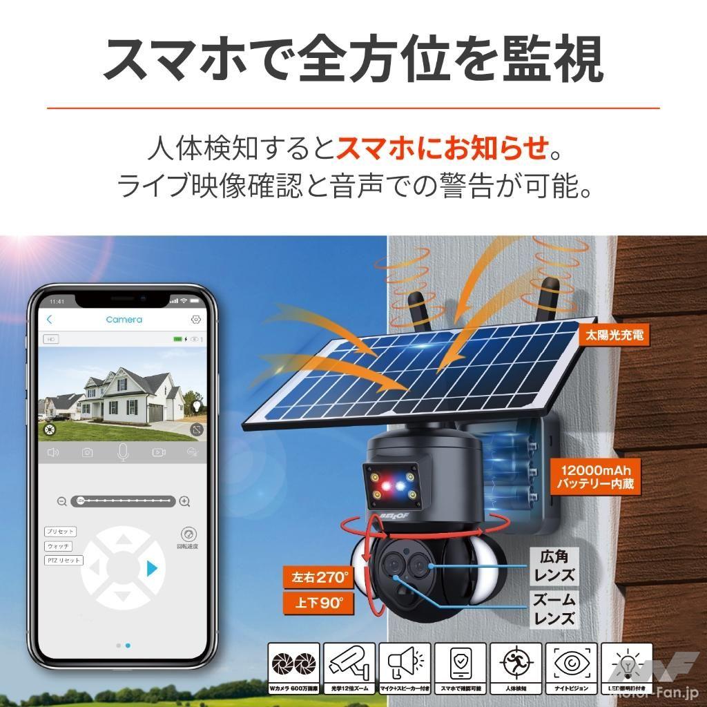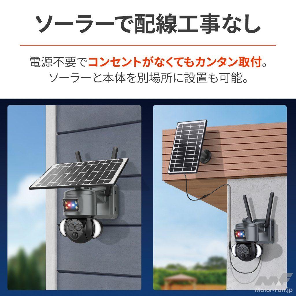 6Wのソーラーパネルと12,000mAhの大容量バッテリーを搭載し、コンセントの設置など電源工事なしで稼働OK。太陽光が当たらない場所への設置は、付属の5mケーブルを使用できる。