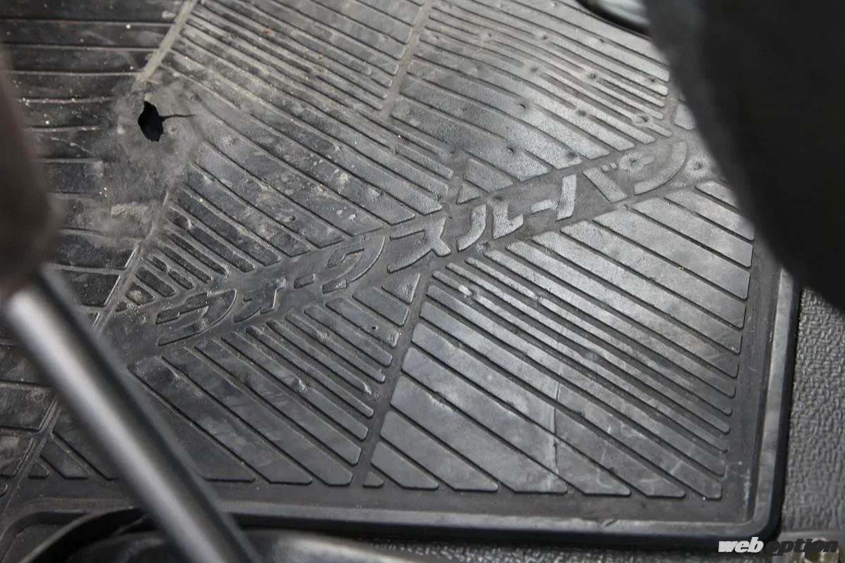 「これ、ぜひ見て下さいよ」とフロアを指さす富松さん。「ゴム製の純正フロアマットなんやけど、ご丁寧に“ウォークスルーバン”って入っとるでしょ?」。確かにこれはレア装備すぎる! 商用車なのだから汎用品でも良いのに、わざわざ専用のフロアマットを用意してしまったところに、ダイハツの大きな意気込みを感じずにはいられない。