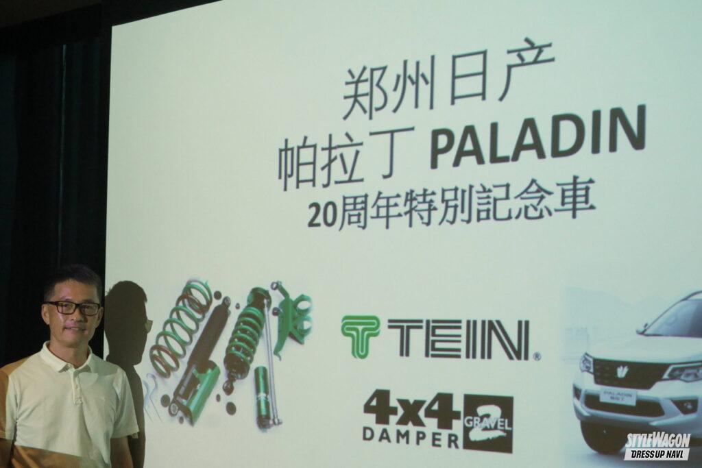 でありテイン中国工場董事長の藤本吉郎氏がスピーチを行った。藤本氏は、テイン創業メンバーであり開発者、ラリードライバーとして数々のWRC参戦経験を持ち、日本人初のサファリラリー優勝者でもある。また、ゲストにはかつてダカールを走破したドライバーであり、パラディン・ブランド・フレンドの周勇氏が登壇。当時のダカールラリーでの思い出や新型への期待を語っていた。