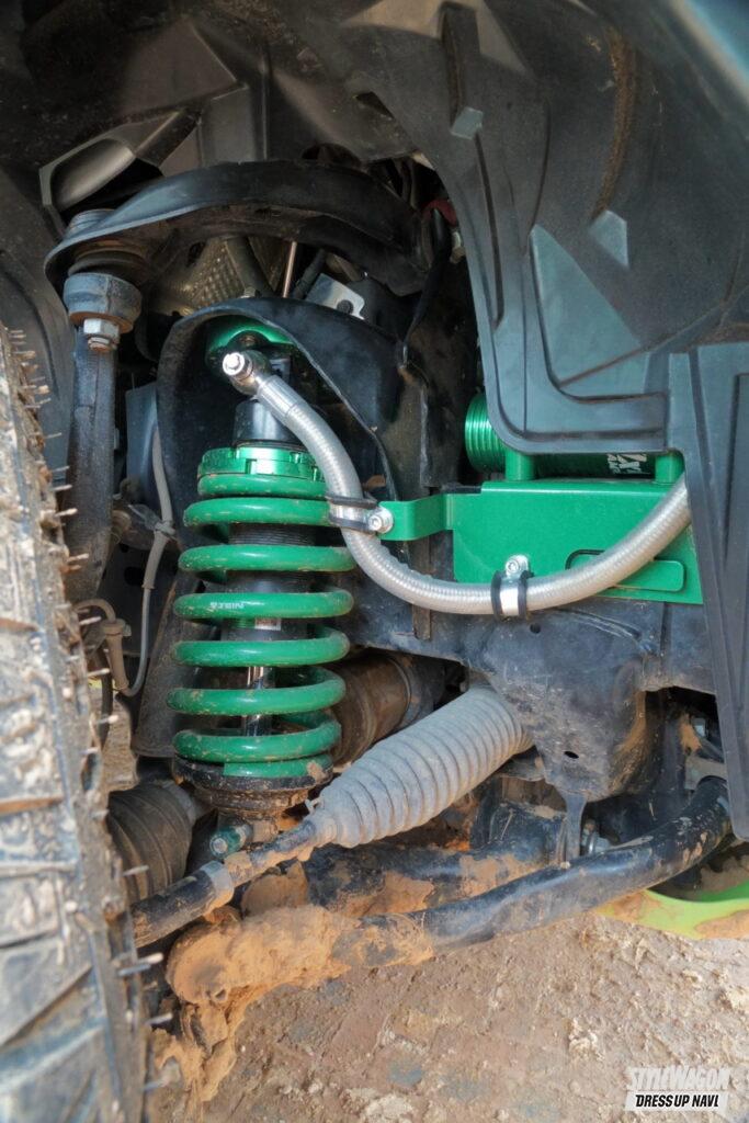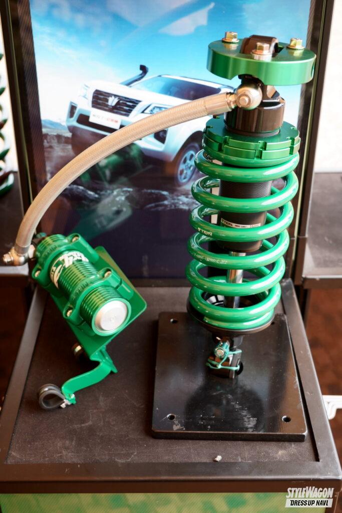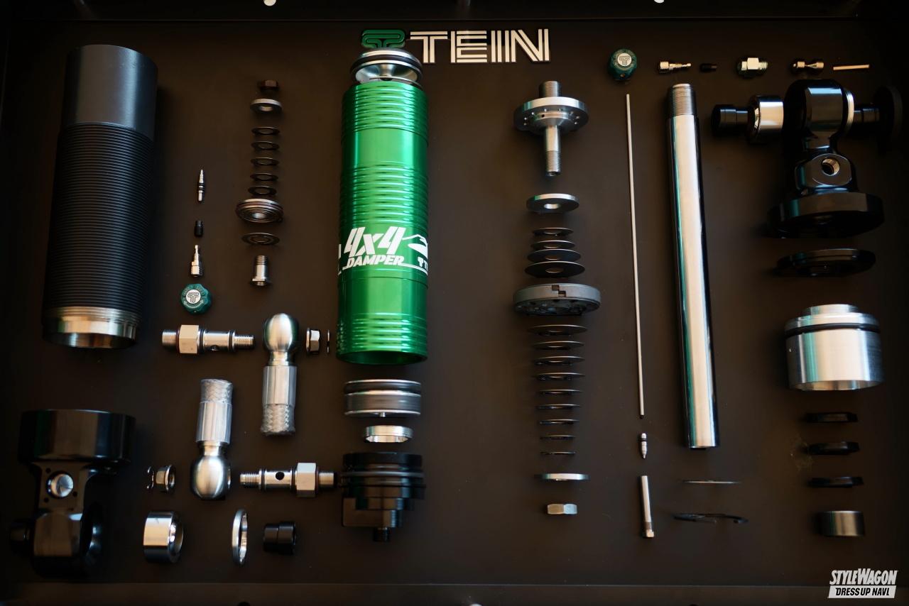そんなパラディン20周年特別記念車に採用となったテイン4×4 DAMPER GRAVEL 2の特徴は、ネジ式車高調であり、φ56mm大径ピストン、φ22mmの高剛性ピストンロッドを採用した単筒式、別タンク式であること。別タンクとすることで、十分なオイル量とストローク量が確保でき、放熱性と余裕ある減衰が可能となるし、なによりも見た目の「フツウじゃない感」も演出できる。これは国を問わずカスタマイズには重要なポイントだ。2way減衰力調整機構を備え、伸側/縮側それぞれに16段階の減衰力調整ができる。ユーザーにとって「後から変えられる」というのは、使ってみたこと無いものを購入するときには特に嬉しいポイント。