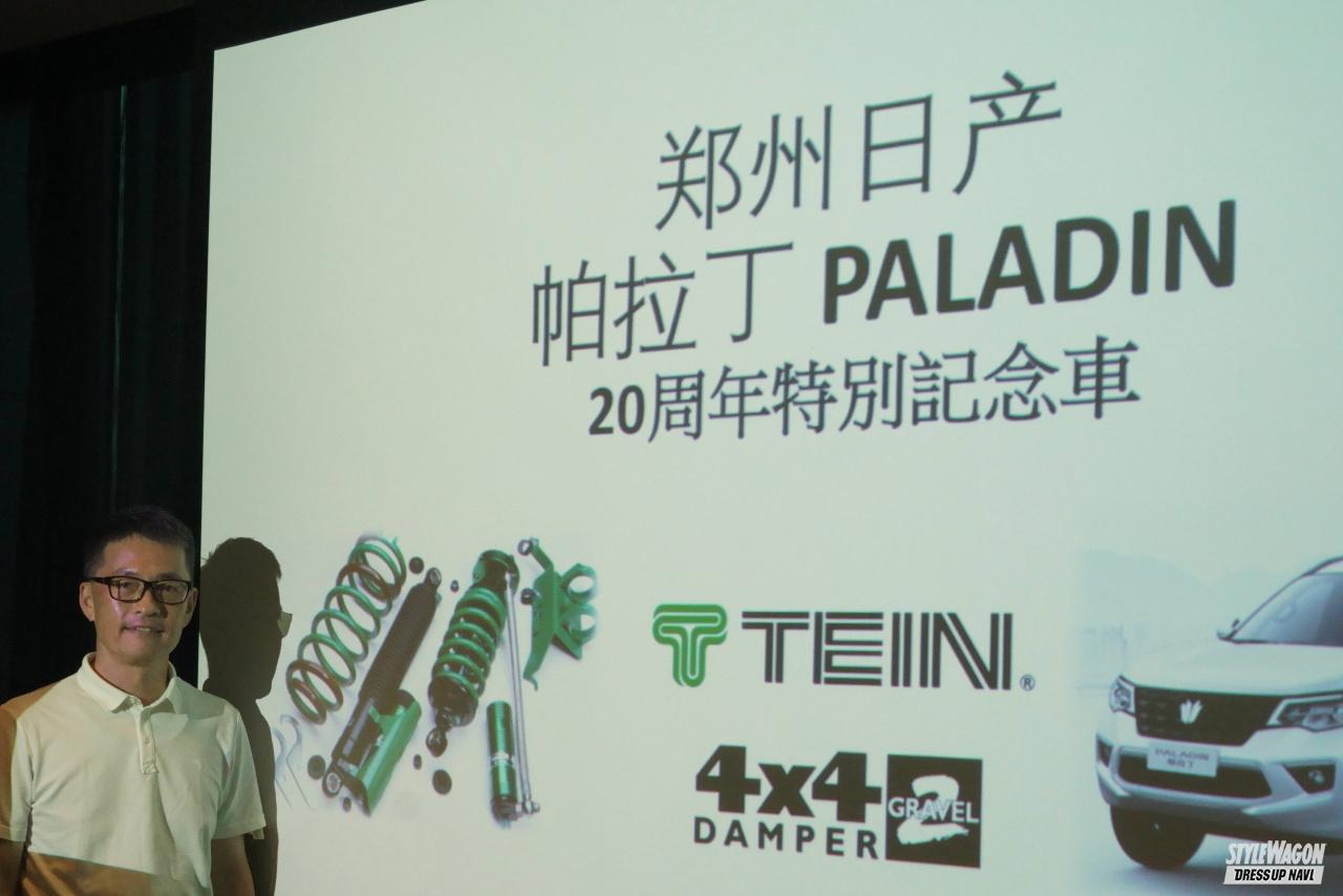 でありテイン中国工場董事長の藤本吉郎氏がスピーチを行った。藤本氏は、テイン創業メンバーであり開発者、ラリードライバーとして数々のWRC参戦経験を持ち、日本人初のサファリラリー優勝者でもある。また、ゲストにはかつてダカールを走破したドライバーであり、パラディン・ブランド・フレンドの周勇氏が登壇。当時のダカールラリーでの思い出や新型への期待を語っていた。