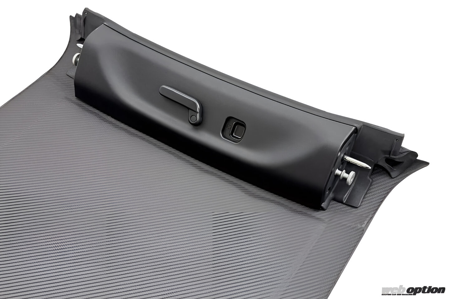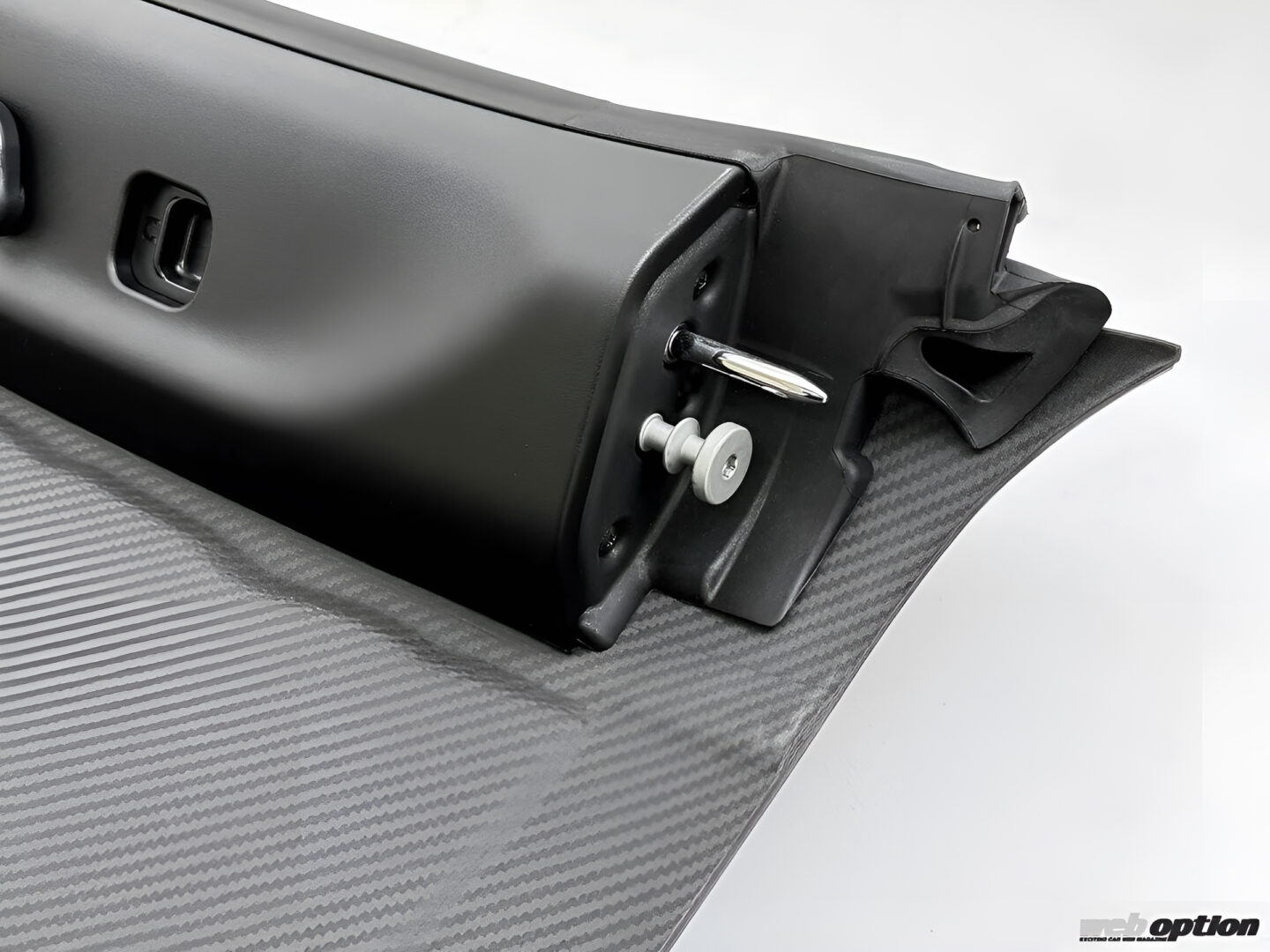 重量は、固定機構や内張り、ウェザーストリップなどフル装備状態で5.2kg。純正のソフトトップ(7.8kg)よりも軽量に仕上げられているのである。また、純正のロック機構(左右)を移植できる構造というのも大きなポイント。つまり、純正と同じ使い勝手でルーフ部分の大幅な軽量化が可能になるのだ。