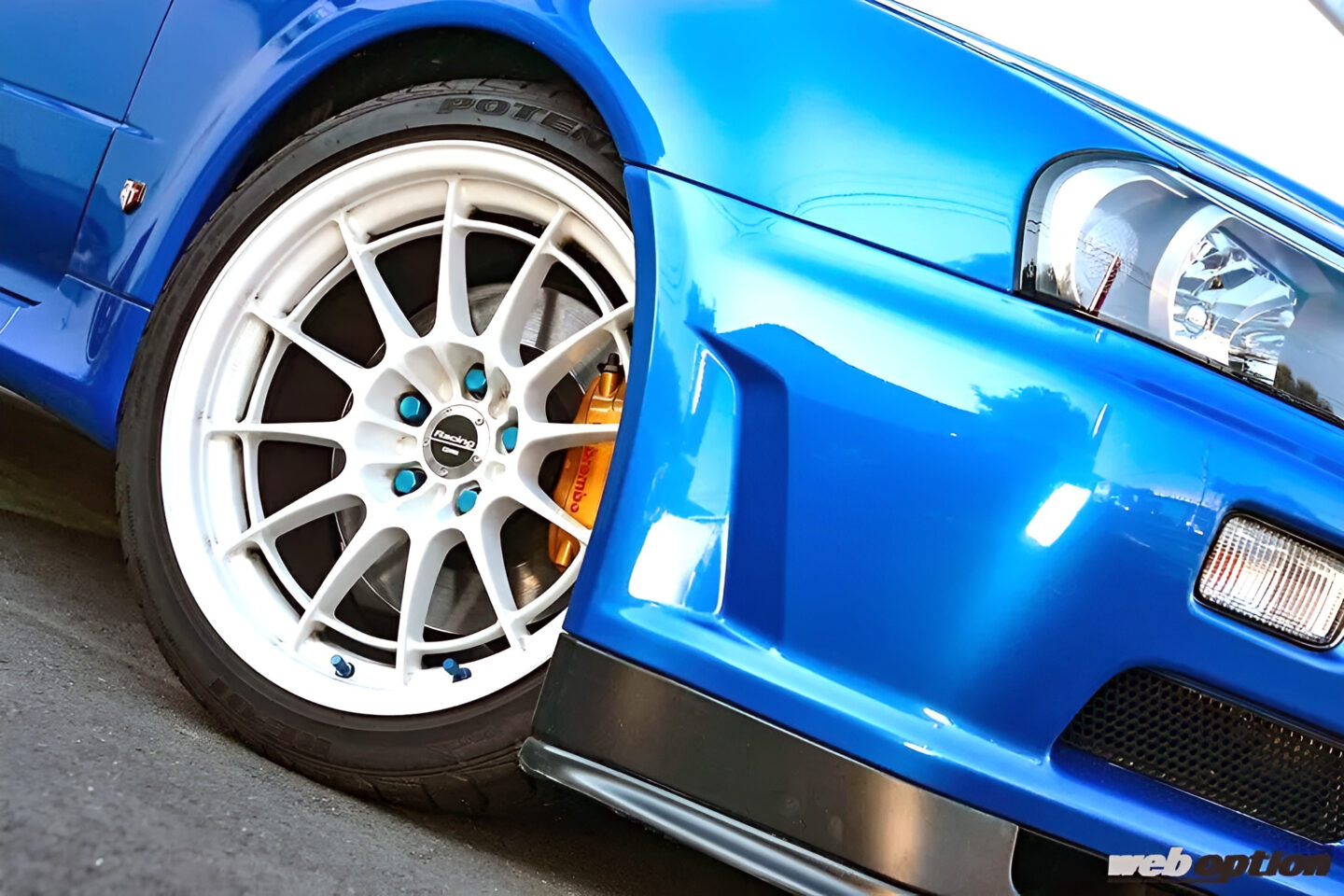 ホイールはエンケイのNT03+M。同じベイサイドブルーのBNR34が装着していたのを見て「コレしかない!」と一目惚れしたそう。スポークが細い分、ゴールドの純正キャリパーがより引き立つのもお気に入りのポイントだ。