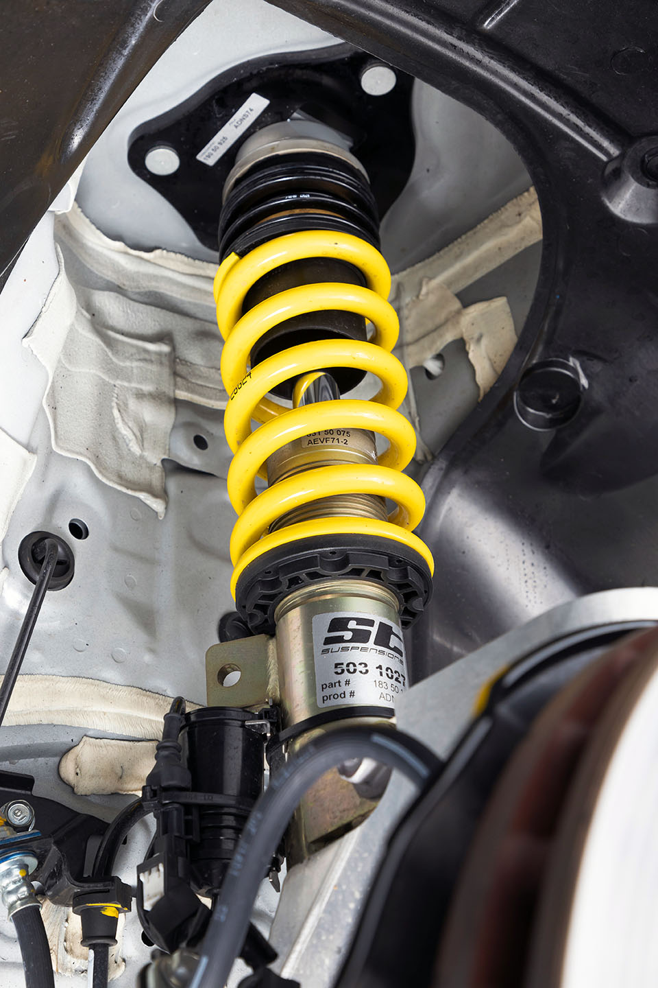 FL5に車高調を装着する際に必要となる電子制御サスペンション用のウォーニングキャンセラーは、KW製キットでは標準付属。一方、STでは別売りとなる点には注意したい。