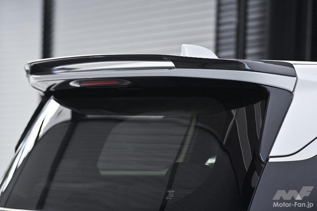 純正のルーフエンドを自然とストレッチしたようなスタイルのスポイラーを開発。カーボン製で、やりすぎ感なく上級感を示唆する。
