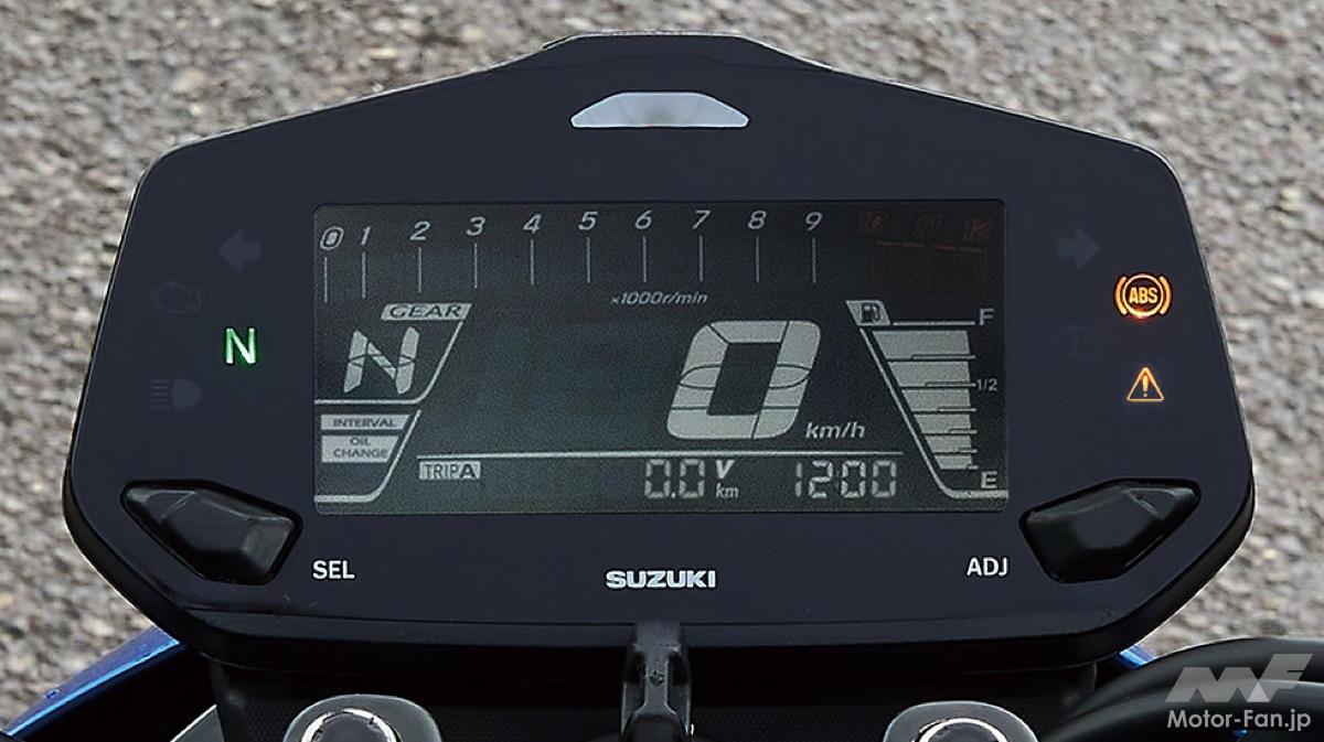 視認性の高いフルデジタル液晶メーターが採用され、ライディング時の情報確認が容易になった。RPMインジケーターは、シフトチェンジの最適なタイミングをランプの点灯・点滅で知らせる機能を備え、スポーツライディングに適した設計となっている。ギヤポジションインジケーター、オドメーター、ツイントリップメーター、時計、オイルチェンジインジケーターも搭載され、利便性が向上している。