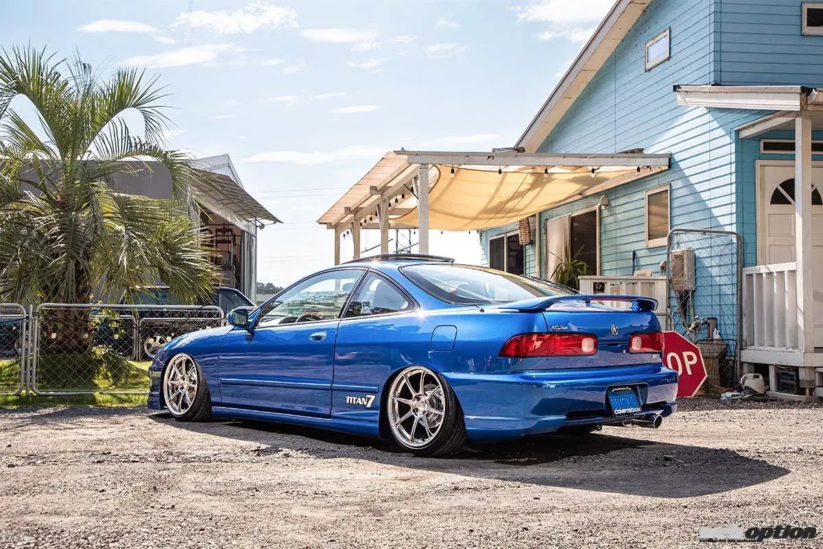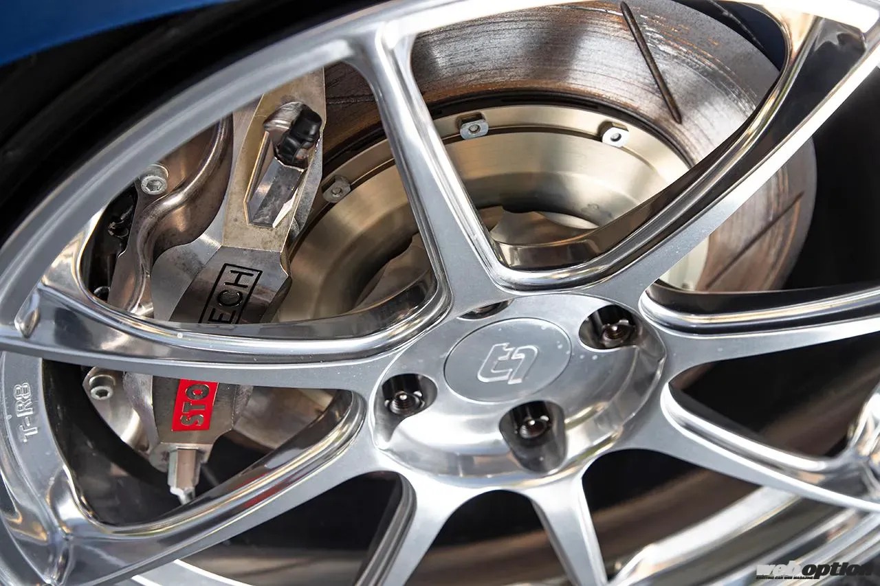 ホイールはアメリカの鍛造ブランド、タイタン7のT-R8を装着。タイタン7は車種専用の削り出しワンピースホイールを提供しているが、DC2用はないためNDロードスター用として展開されている9.0Jプラス45×17インチを履かせている。フロントブレーキは4ポットのStoptech STR40と328mm2ピースローターの組み合わせ。