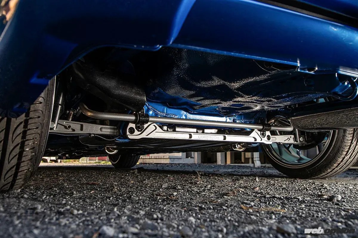 アンダーボディもサファイヤブルーメタリックで塗装。リヤサスにはComptechのリヤサブフレームとスタビライザー、FCRのロワアームのほか、PCIのトレーリングアーム、トーアームなどが組まれ、アライメント調整に対応する。