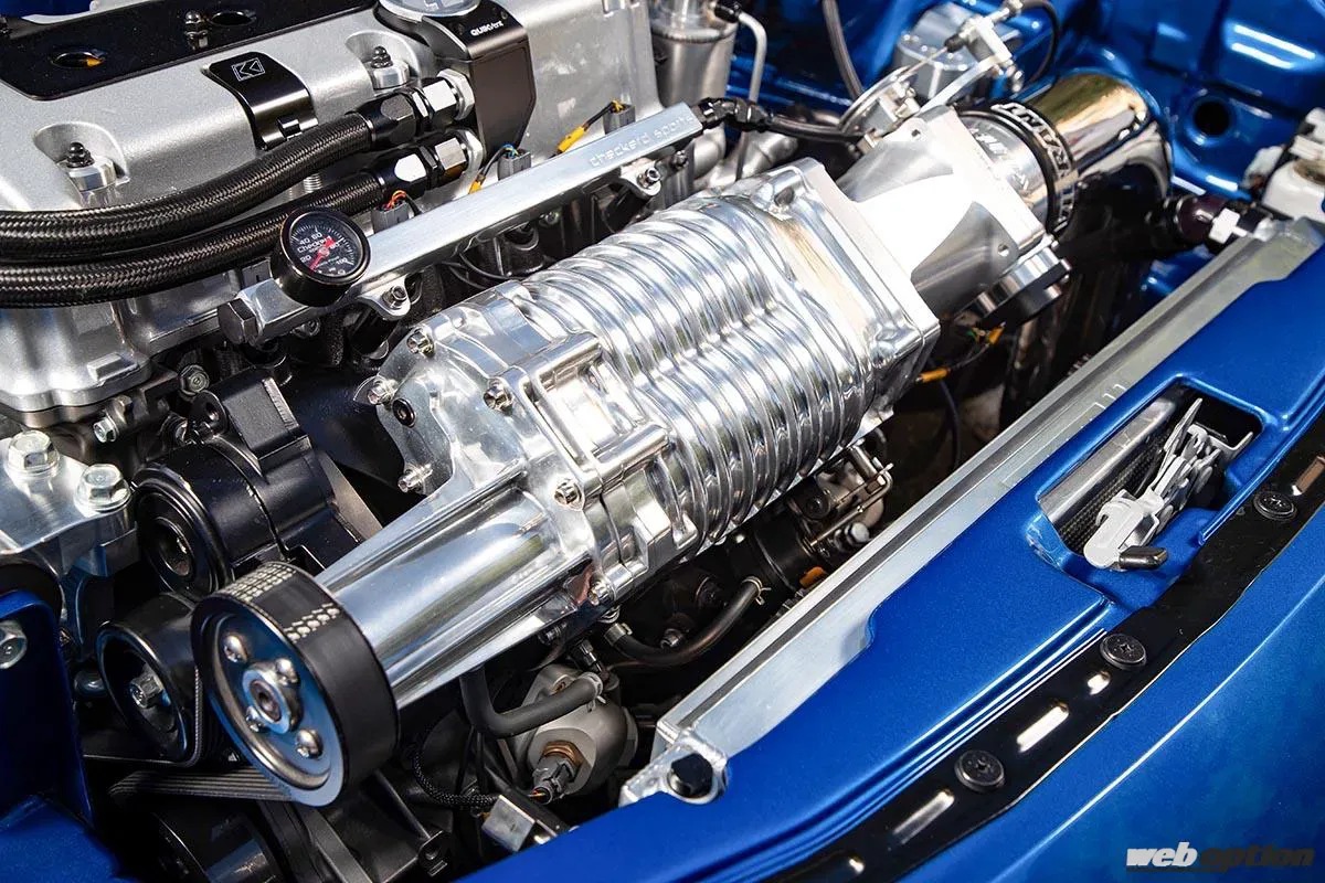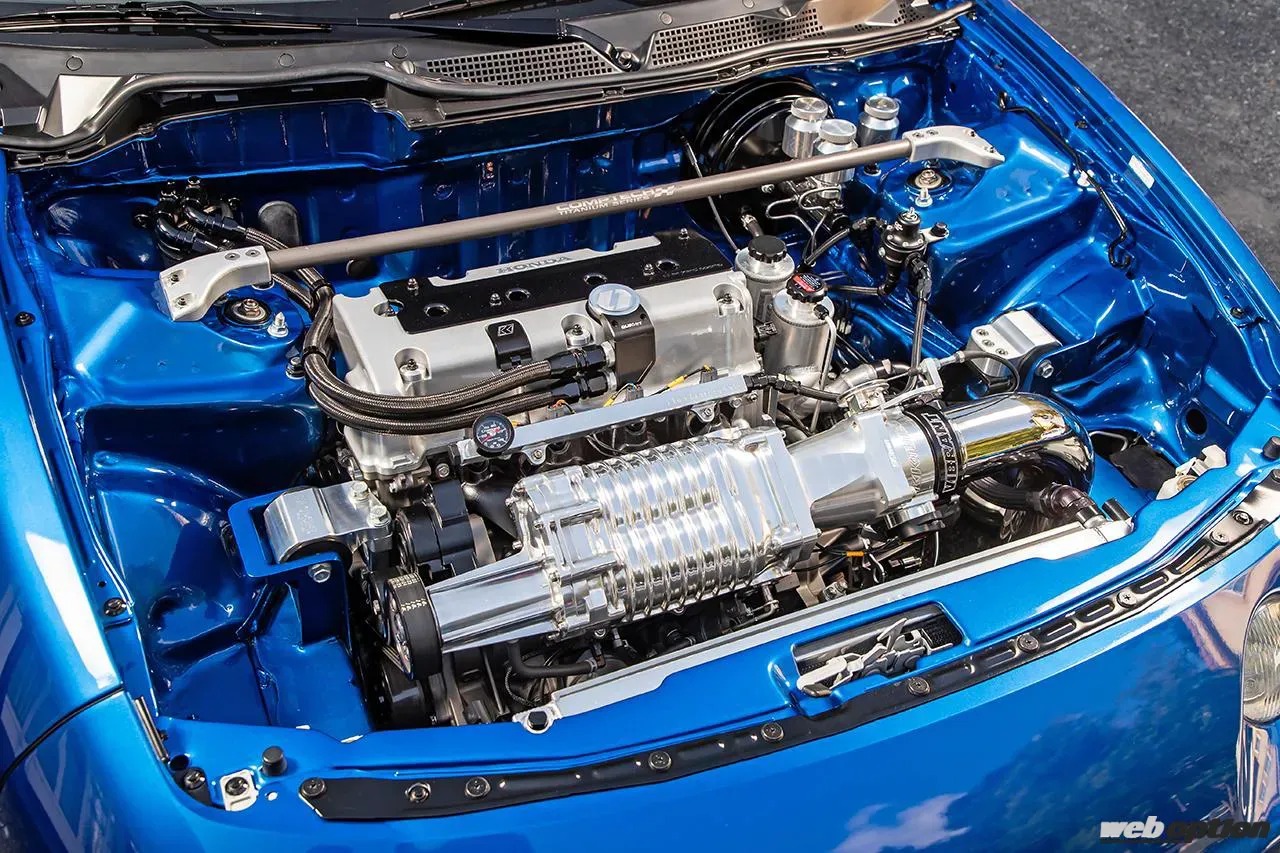 さらに、アコードツアラーで使用していたCTエンジニアリング(旧コンプテック)のスーパーチャージャーも搭載し、ドーピングによるタイプR超えもアッという間に実現。エンジンの載せ替え作業と始動させるまでの作業は岡山県のライコンで行ない、「純正で最初からそうなっているような載せ方をして欲しい」という小林さんからのオーダーに応えた。