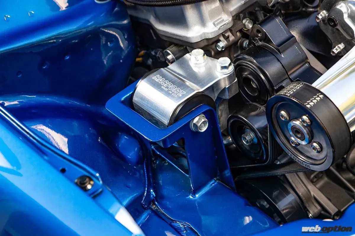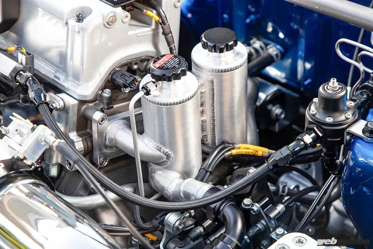 KOYORADをベースにしたタックドラジエターとファンシュラウドは、Kスワップ専用の作り物を多く手がけているアメリカのTrac Tuffから調達。エンジンの横に備わるスワールポット(ブリーザータンク)とオーバーフロータンクも同様で、機能性とすっきりした見た目の両立に貢献している。