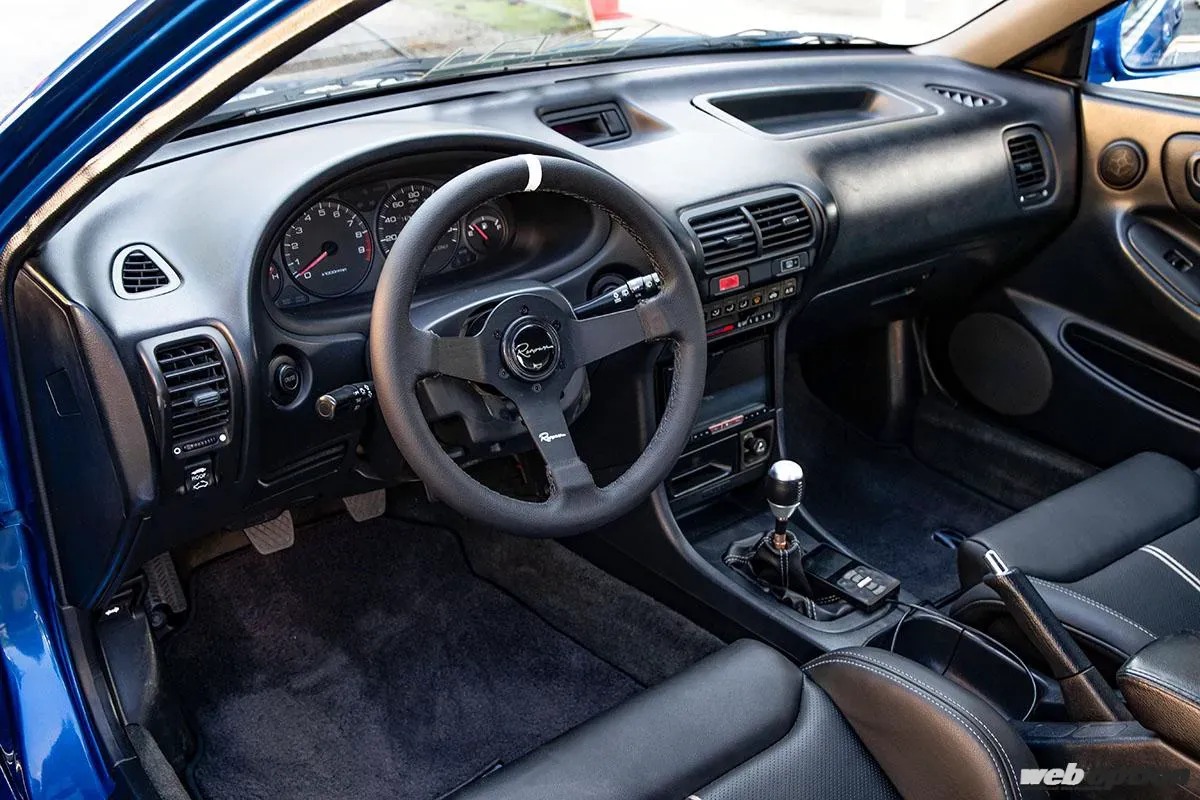 純正のレザー内装を活かしたインテリアにはレナウンの130Rというレザーステアリングを装備。トランスミッションがCL7の6速MTに変わっているため、位置合わせとリンケージにはアキュラTSX純正のシフターボックスとケーブルを利用した。
