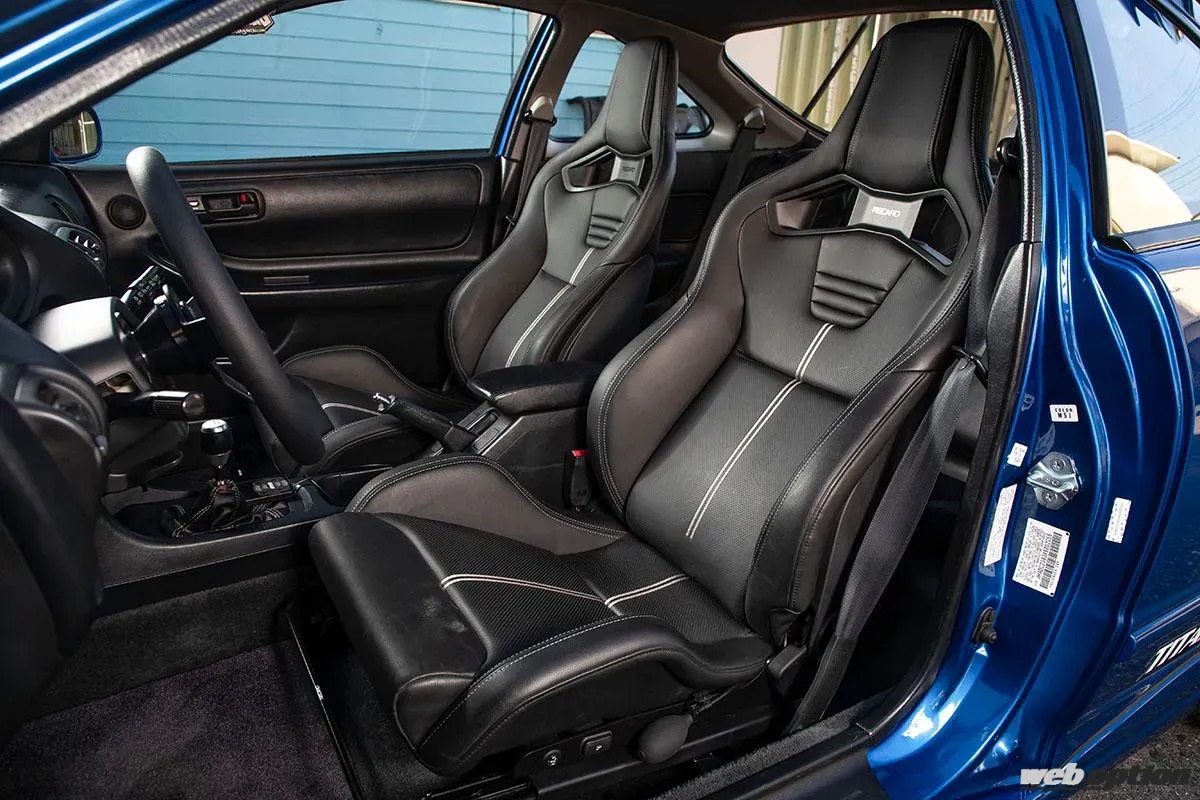 シートは電動リクライニングとシートヒーター、手動のランバーサポートが備わるレカロのスポーツスターを装備。リヤシートも同じタイプのレザーで張り替えを行ない、統一感を生み出している。