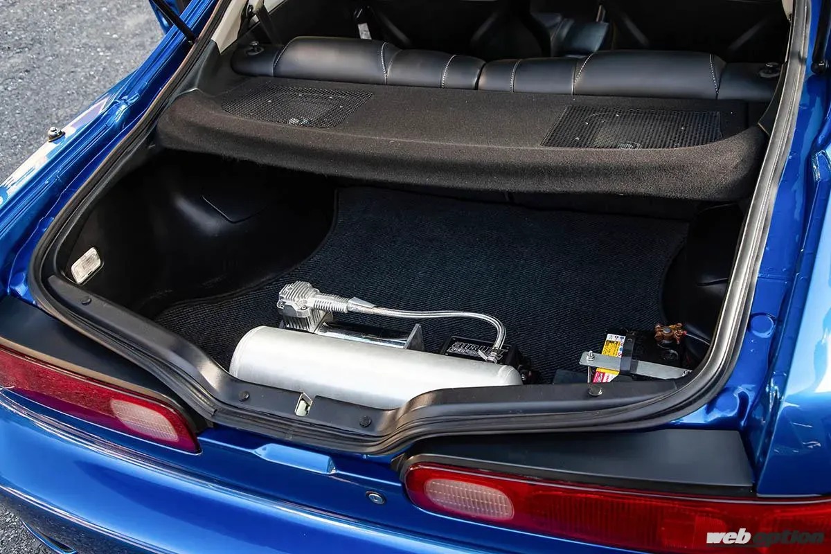 トランクルームにエアリフトのコントロールユニットやエアタンク、コンプレッサーをインストール。ダンパーは静岡県のシビック専門店であるサウスサイドが開発した、細身のエアバッグがついたものを使用している。