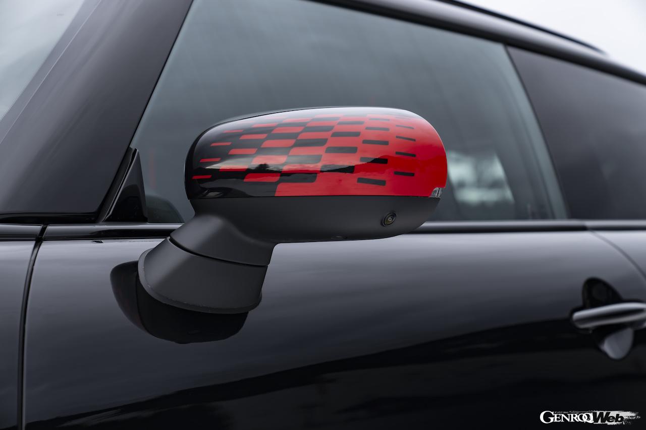 フロントグリルには、ブラックの「JCW」ロゴをあしらった「MINI JCWトウストラップ」の追加が可能。高品質なアクセサリーデザインは、世界ラリー選手権(WRC)に参戦するラリーカーに由来する。また、チェッカーフラッグをデザインしたブラックとレッドの「JCWエクステリア・ミラーキャップ」も、モータースポーツへのリクスペクトが込められている。