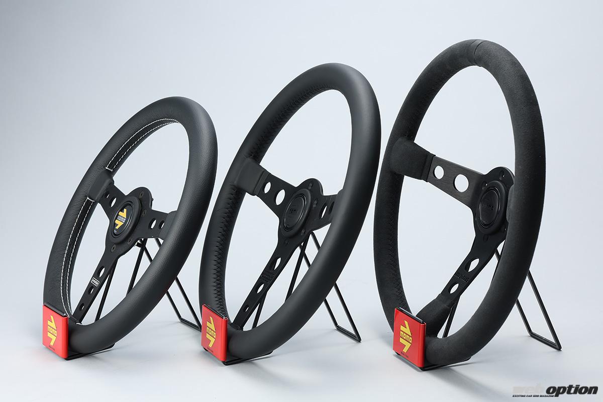 ステアリングは外径選びも重要なポイントだ。一般的に、小径ステアリングはクイックなステアフィールを生むが、極端に小さいとパワステ付きのクルマでも操作が重くなることもあるので注意が必要。MOMOの基準径は350mmだ。