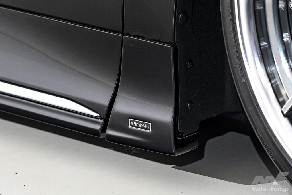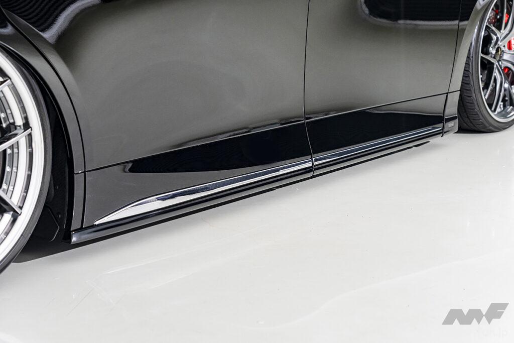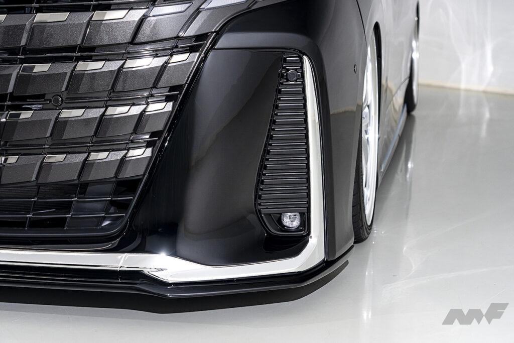 フロントはヴェルファイアの純正バンパーをイメージしたデザインを取り入れることで、品の良さを崩すことなく印象をガラッと変える。このバンパーには専用のアンダーリップが付属し、純正バンパーにリップを付けたかのようなさり気なさも楽しい。「いかにも変えました」というフィニッシュがイヤなユーザーにもオススメだ。リアに関してもバンパータイプを採用しているが、こちらはABS製・クローム調のマフラーエクステンションタイプBが付属。左右出しマフラーをインストールしたかのようなインパクトも手に入る。そして薄型のサイドスポイラーも設定しており、フロントからリアにかけてのトータルバランスはパーフェクト。