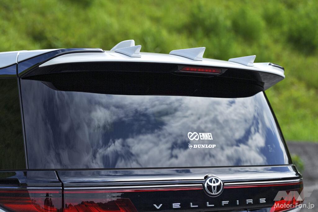40ヴェルファイア用アイテムも同様。『エアロスピードRコンセプト』シリーズのエアロは〝らしい〟スポーツ性を感じさせるデザインながら、大きすぎず、走りを邪魔しない。ダンパーZZ-R車高調で適度にローダウンされた車高との相性も抜群で、総合的にワイド&ローを演出する。ユニークなのは純正ルーフスポイラーにつける3点構成のアイテム。純正の窪んだ形状を補正しつつ、フィンスタイルでシャープさを付与。さり気なく個性とスポーツ性をプラスする。
