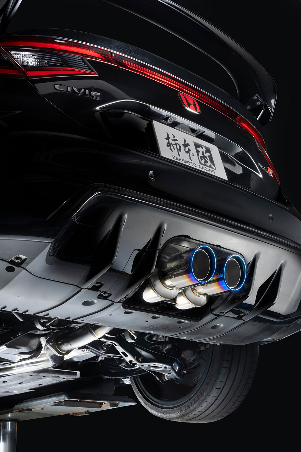 フロントパイプは純正の65φから70φへと拡大され、2.0Lターボエンジン(K20C)のポテンシャルを効率よく引き出す設計とされた。一方で消音性能と音質向上のため、センターパイプにはサブサイレンサーを直列に2か所配置。さらにリヤメンバー後方には2基のサイレンサーを並列配置している。