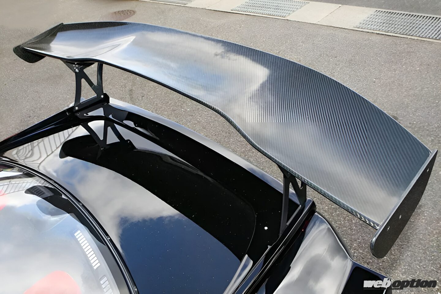 エクステリアでは、ワンオフのワイドボディが強烈な個性をアピール。形状はスーパーGTなどの空力トレンドも盛り込まれているが、ブラックのボディカラーと大きく張り出した前後フェンダーの処理はインパクト抜群だ。