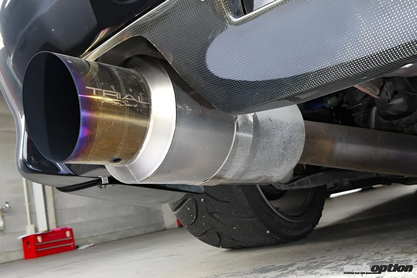 エキゾーストはトライアルのオリジナルチタンマフラーで武装。メインパイプ80φで低中回転からベストな背圧を保持してくれる車検対応仕様だ。