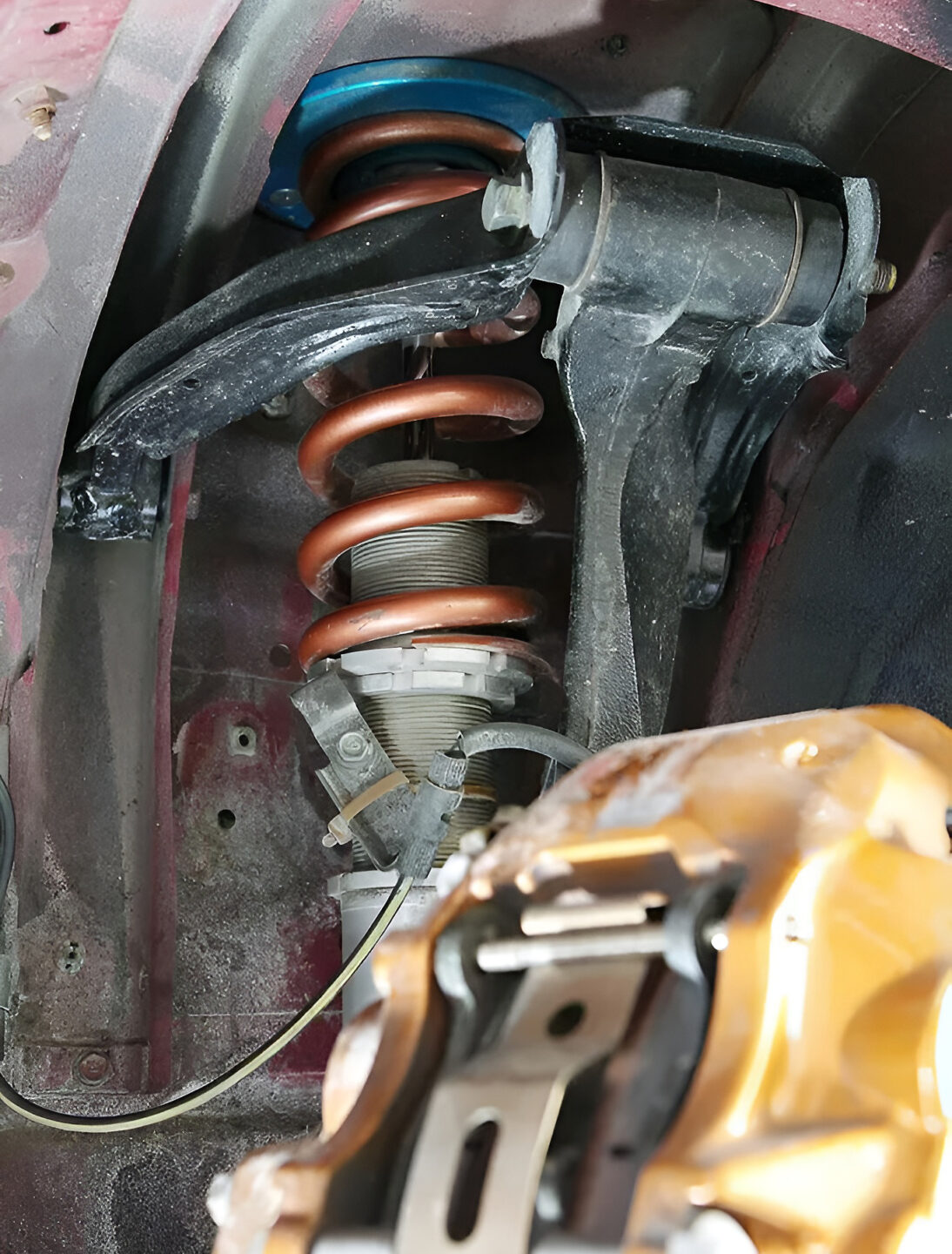 足回りはオーリンズ改車高調(FR18kg/mm)を軸に構築。ギリギリまでブレーキポイントを遅らせて走る、突っ込み重視のドライビングスタイルというオーナーに合わせて、ブレーキはフロントにブレンボ6ポット+370mmローター、リヤにブレンボ4ポット+343mmローターをセットして強化する。LSDはクスコを奢る。
