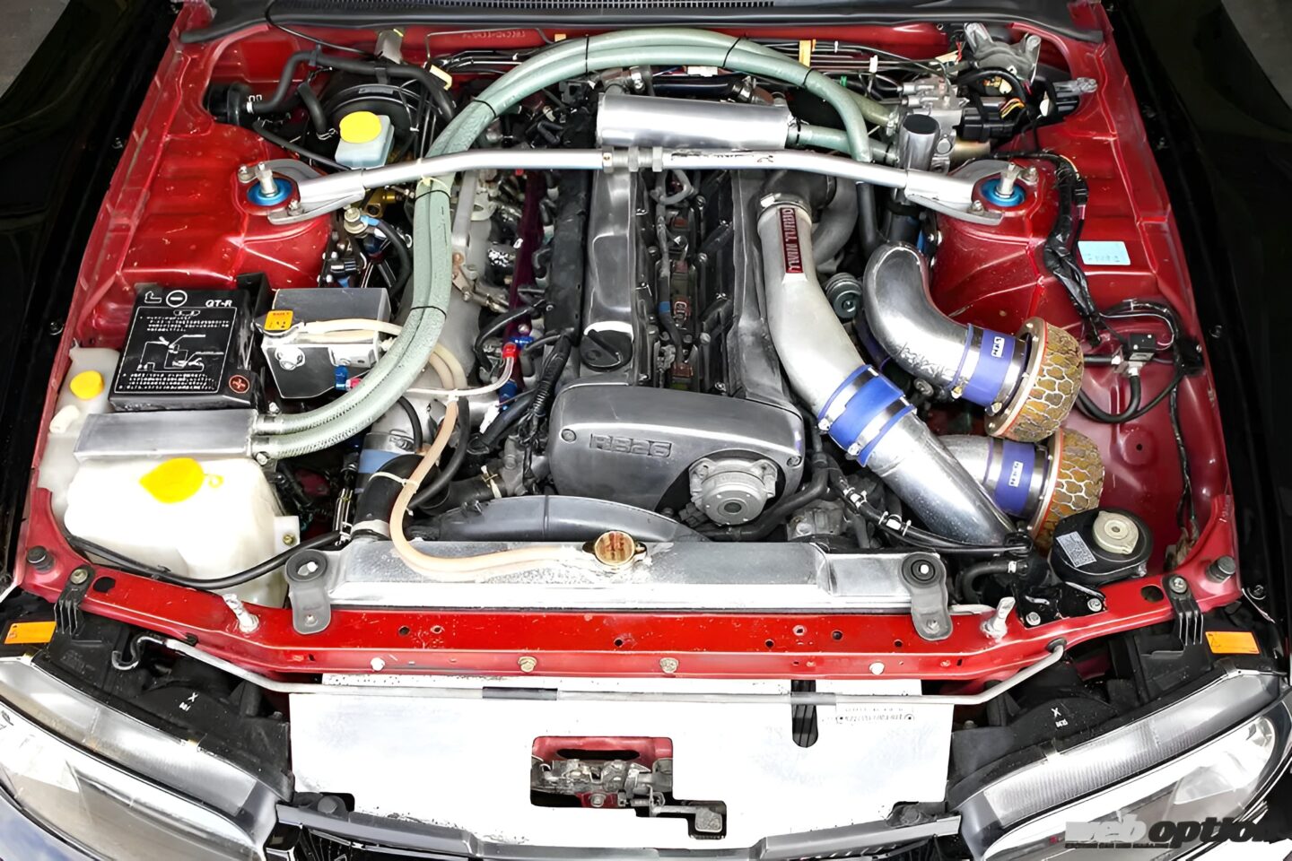 心臓部のRB26DETTは、腰下をトラスト鍛造ピストン&H断面コンロッドで強化した上、ヘッドにはHKSハイカム(IN&EX:264度)を投入。そこにGT-SSタービンを組み合わせて、ブースト1.3キロ時に560psを発揮。パワーはかなり抑えられているが、大容量ラジエターやオイルキャッチタンクの装備など、今後のステップアップも見据えたモディファイがなされている。