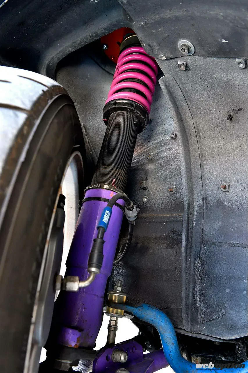 一方の足回りは、基本に立ち返ってまずブッシュ類を全交換。ダンパーはテックアート×アラゴスタのオリジナルを組み、前後ブレーキにはエンドレスの4ポット(S13ローター)を投入。補強系も抜かりなく、トルクブラケットや強化スタビもセットアップされている。